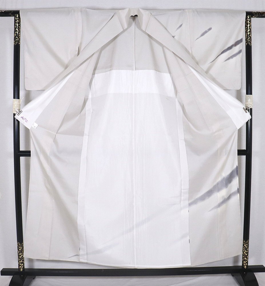 | 紗紬 友禅訪問着 ライトグレー・小格子地 墨黒斜め縞 創作柄 161 広襟 居敷当て付き 新品 仕付け付き | |