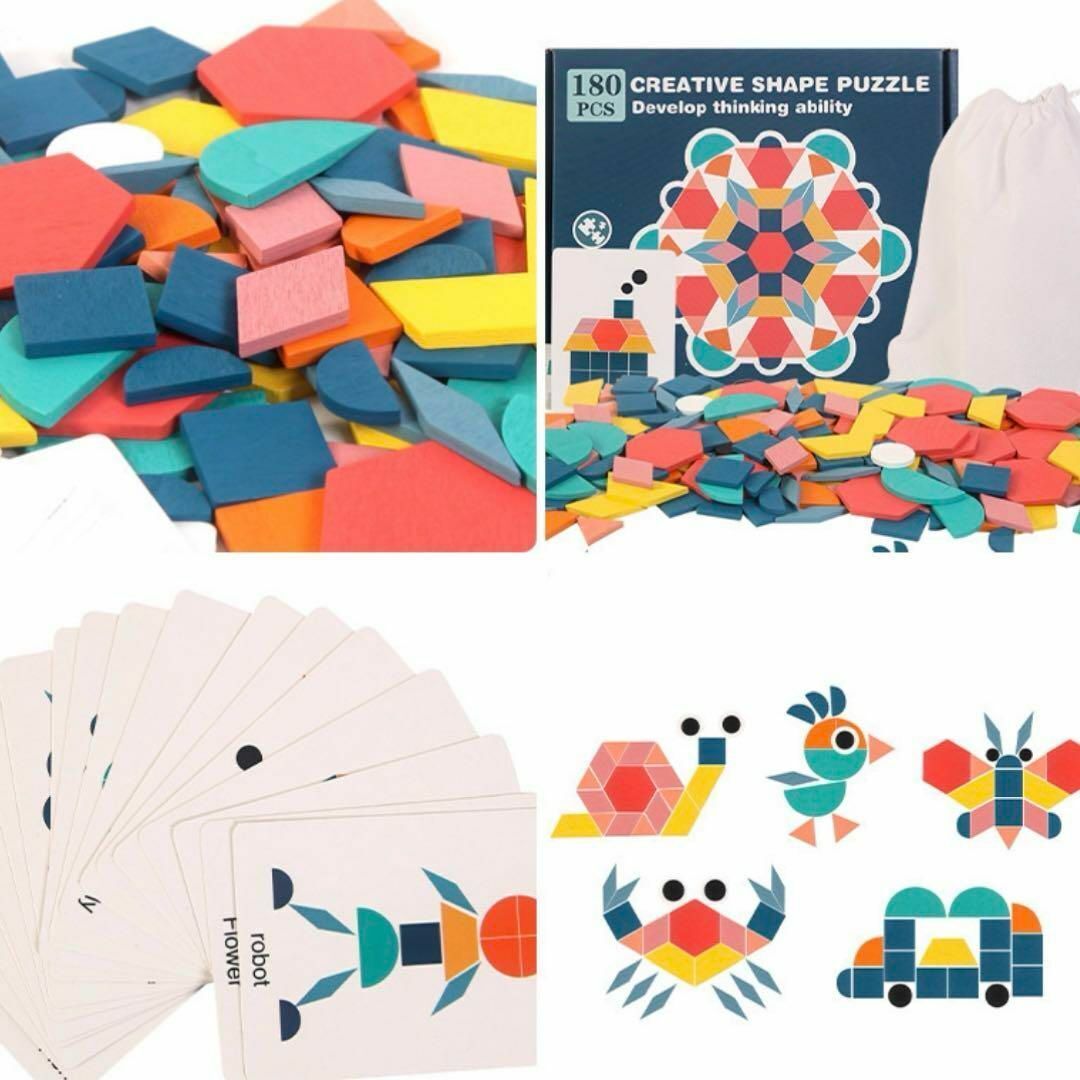 カラフルで可愛らしい木製ピースを使って、自由に形を作ったり、見本カードを使って図形を完成させたり、遊びながらお子さまの考える力を自然と育むことができます。