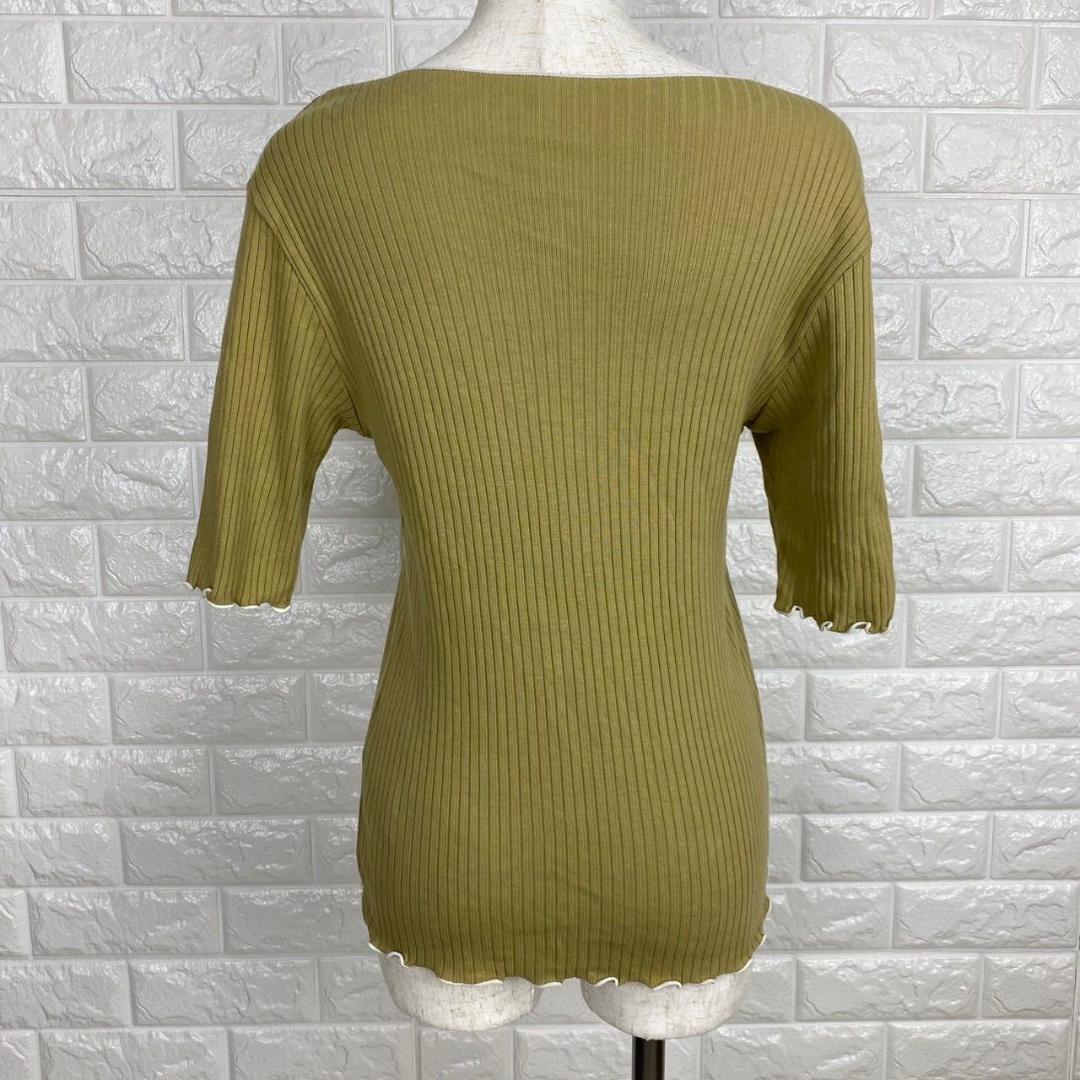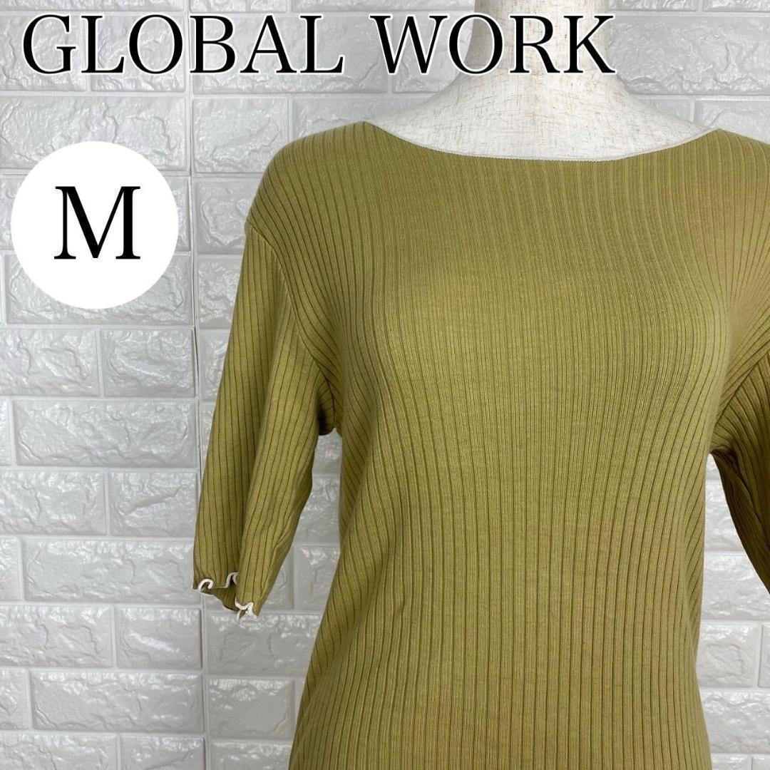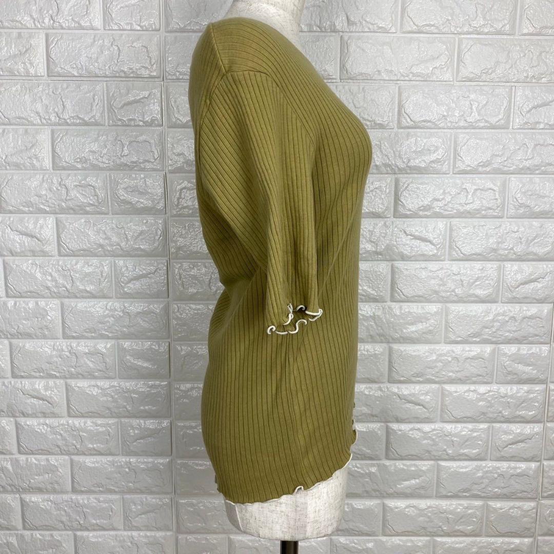 【AA1829】 グローバルワーク GLOBAL WORK M リブカットソー 半袖 スカラップ 袖フリル風 カーキ リブニット オリーブカラー