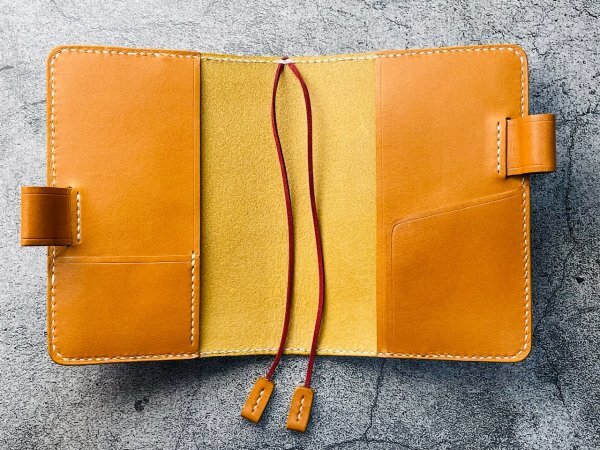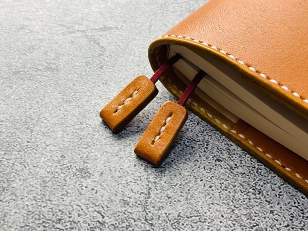 □2箇所に入れられるのスエード紐のしおりも付けました。