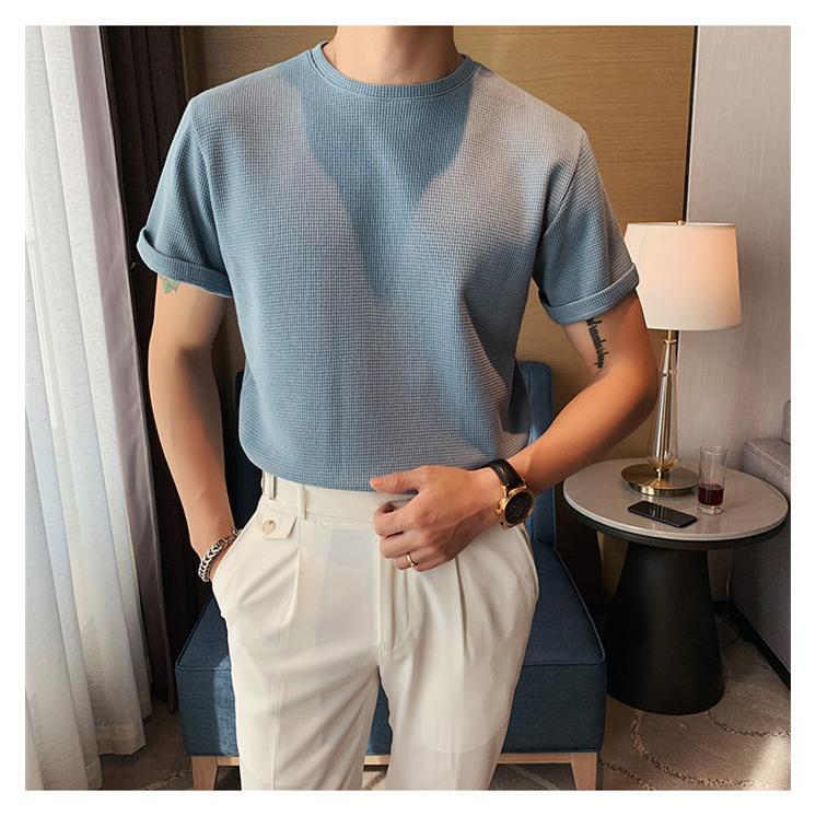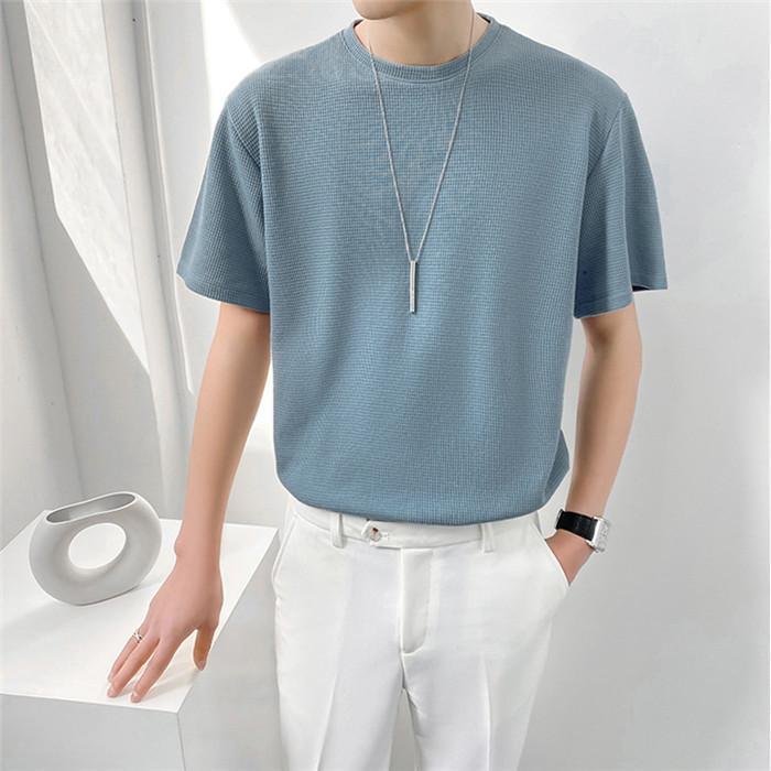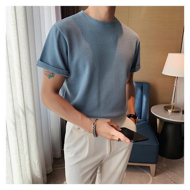キレイめ 夏 無地 薄手 クルーネック サマーニット メンズ トップス クルーネック半袖ニット Tシャツ ブルー 2XL