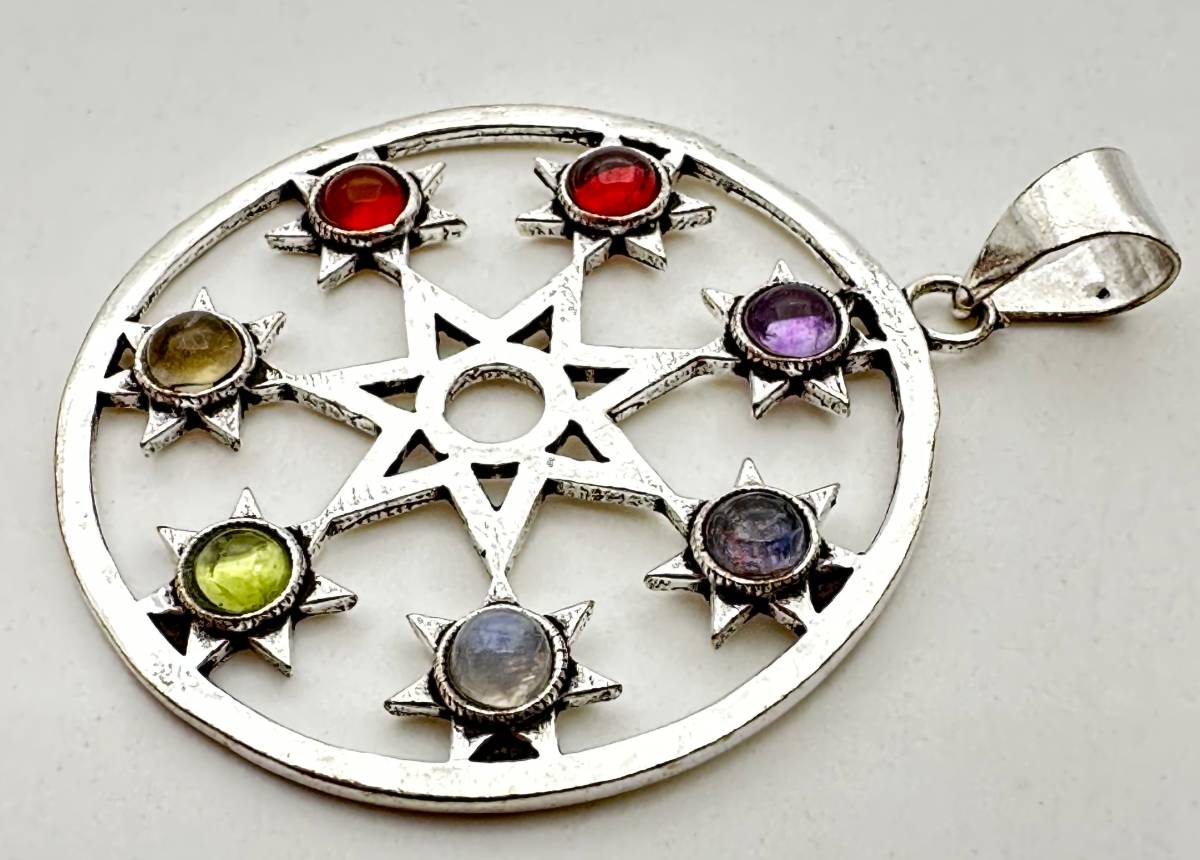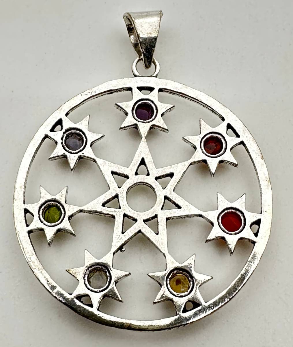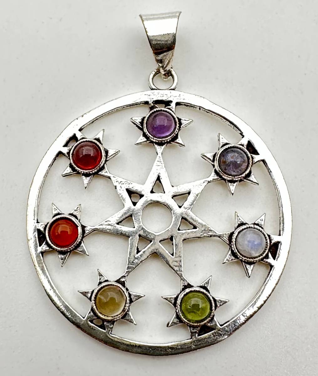 チャクラをあらわす7つの天然石と七芒星のペンダントトップです。