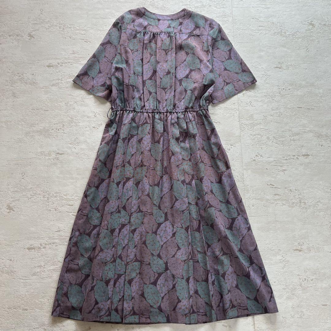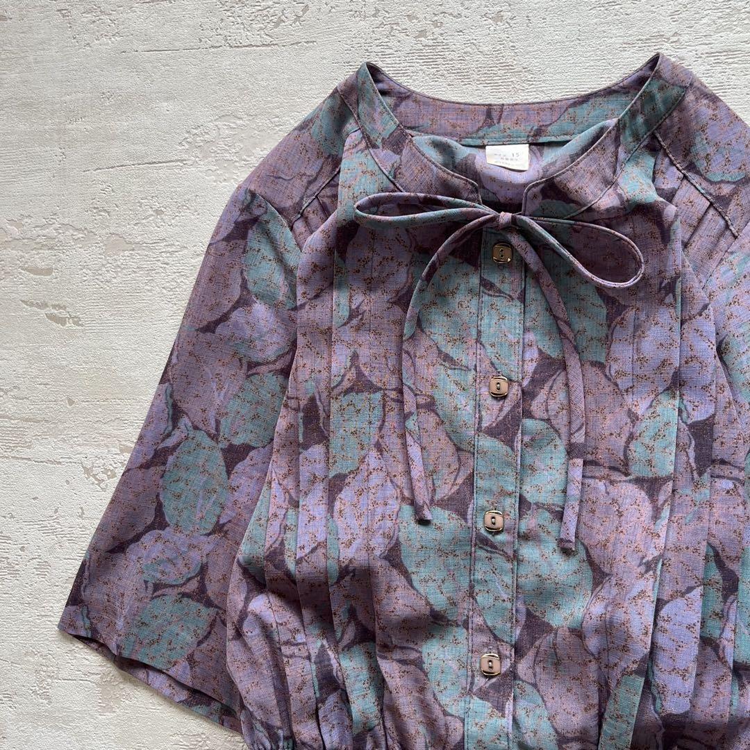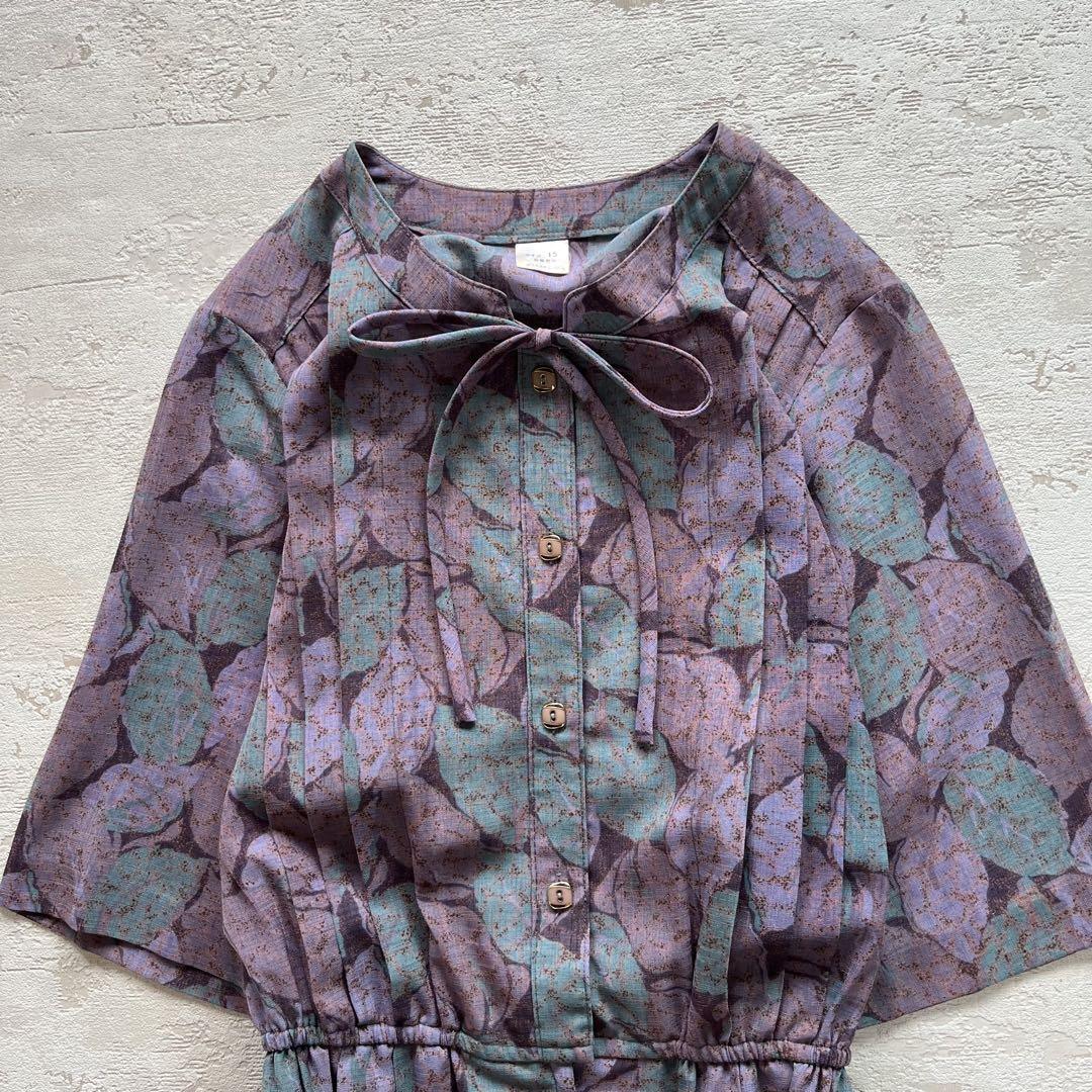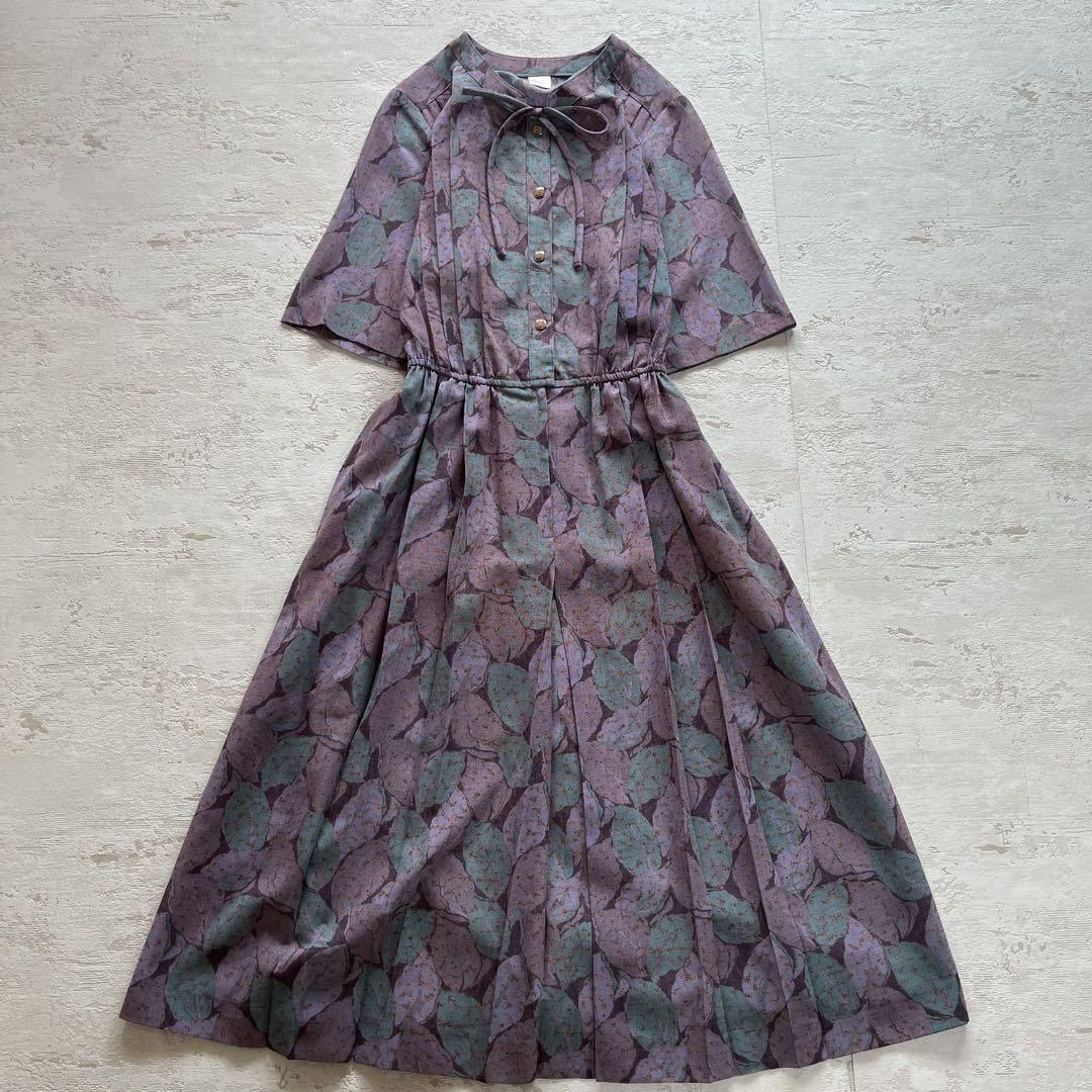 昭和レトロ渋かわ半袖ロングワンピースリーフ柄リボン付きパープル15号N2