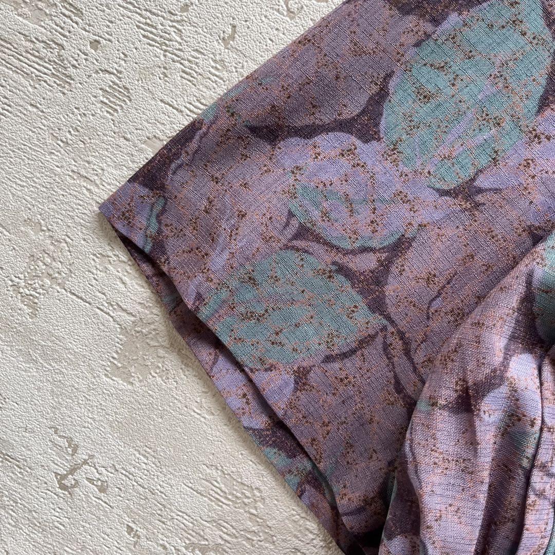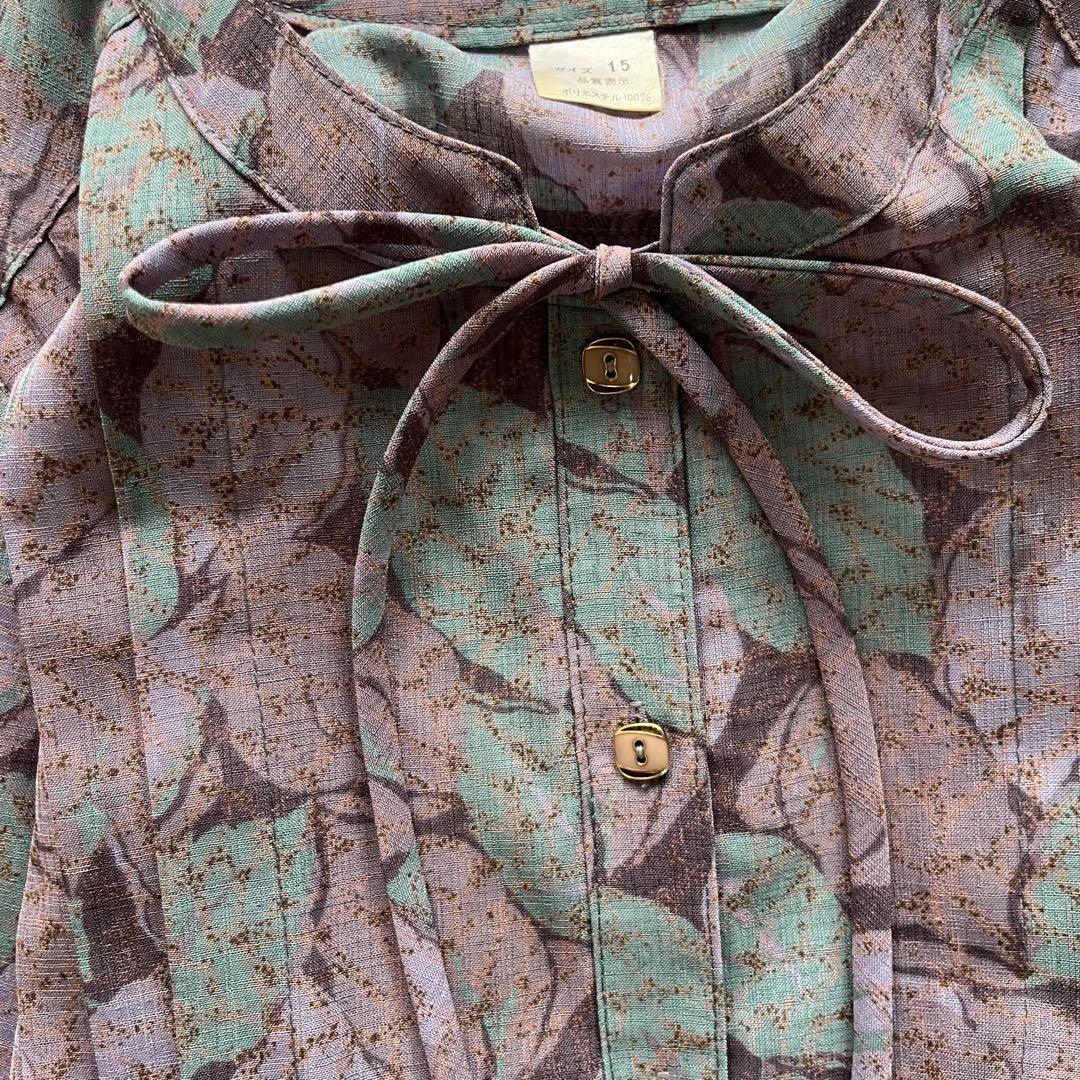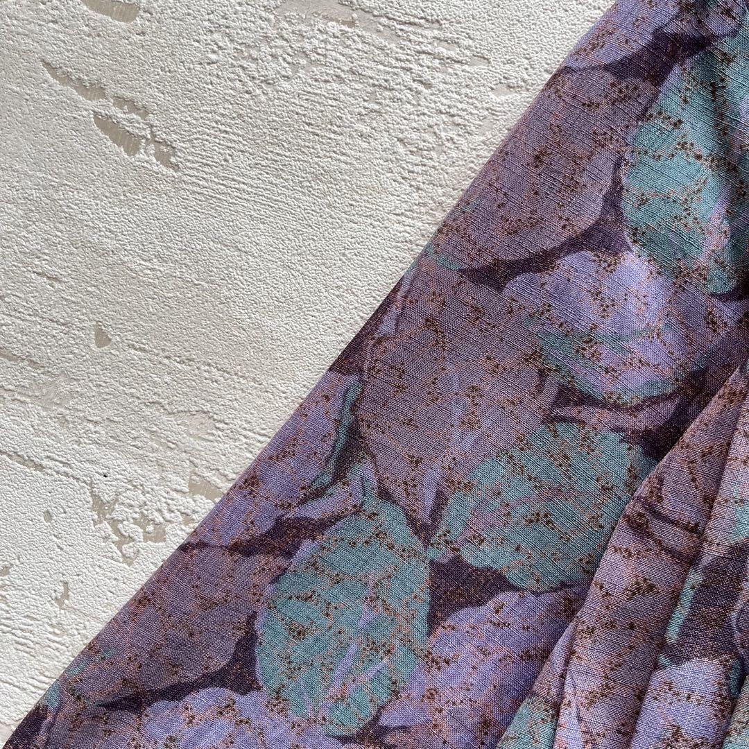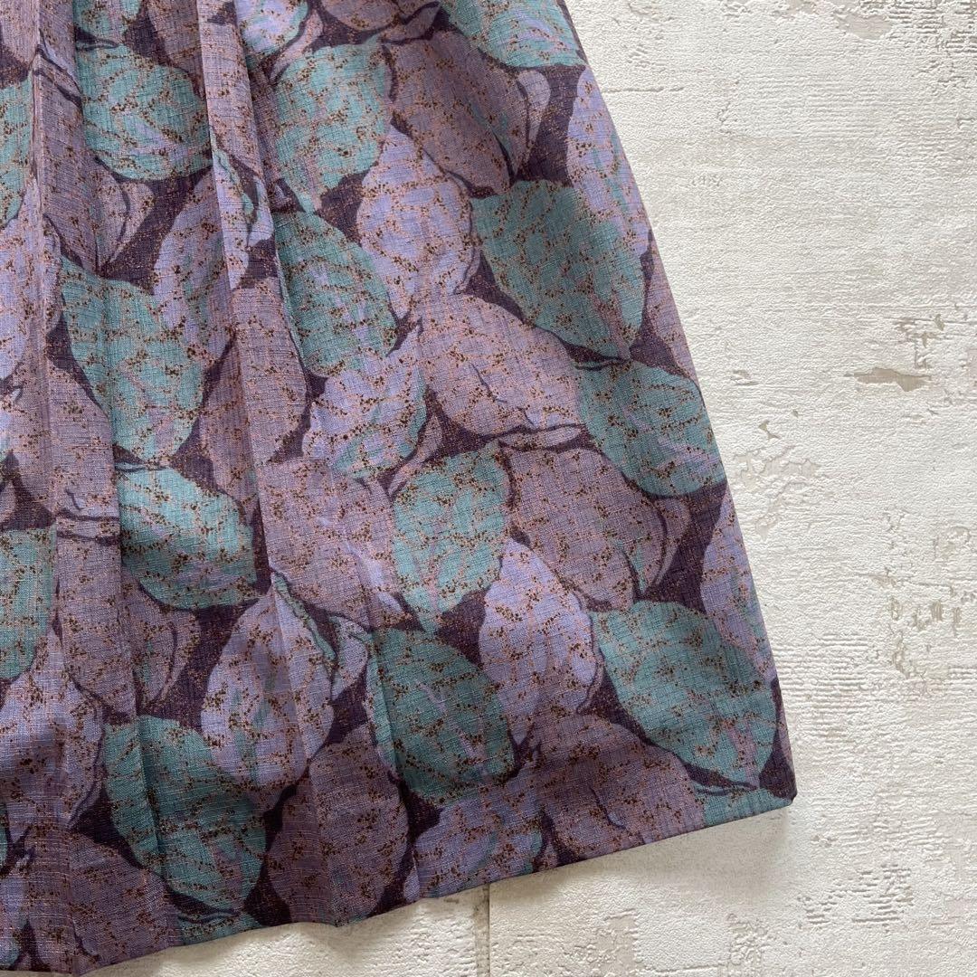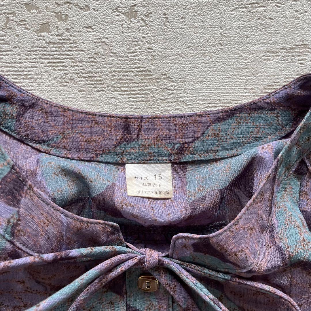 昭和レトロ渋かわ半袖ロングワンピースリーフ柄リボン付きパープル15号N2