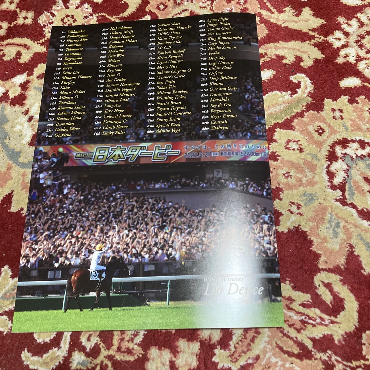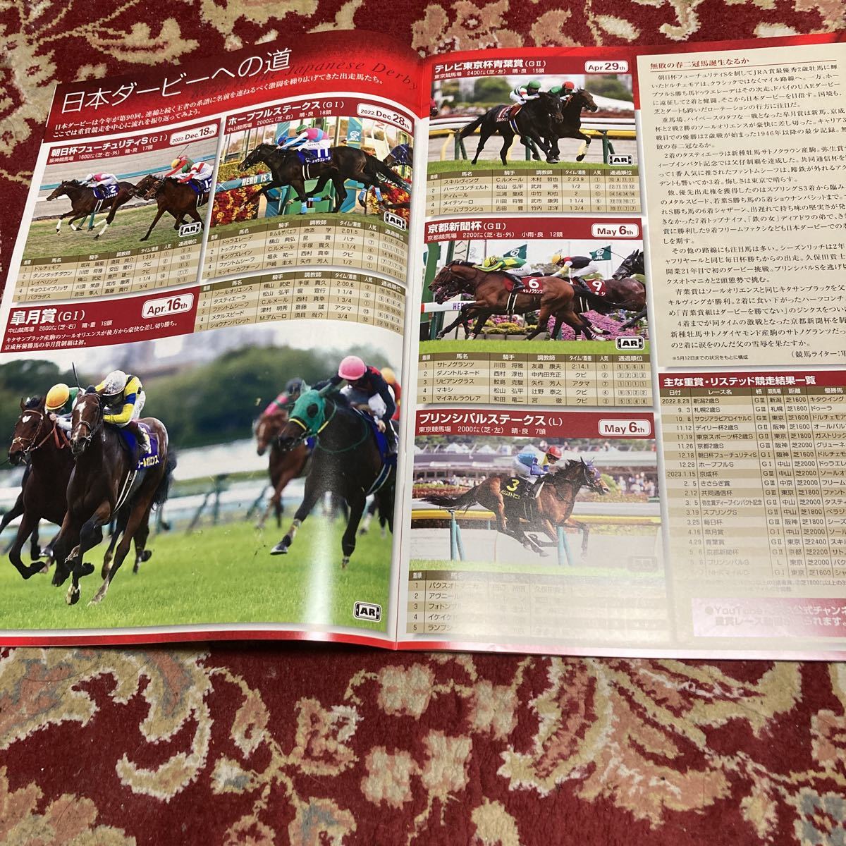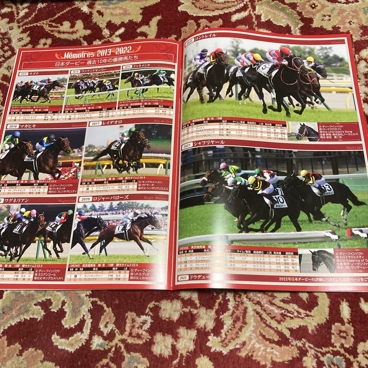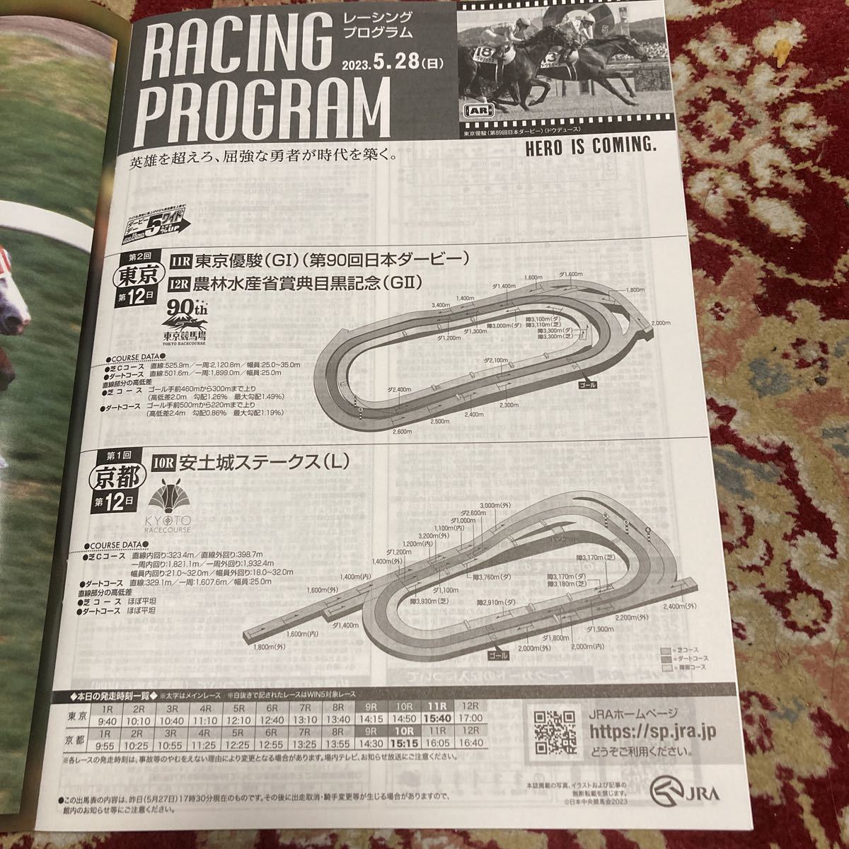 JRAレーシングプログラム2023.5.28(日)東京優駿(G I)、目黒記念(GⅡ)、安土城ステークス(L)になります。タイトルは、『英雄を超えろ、屈強な勇者が時代を築く。』です。第2回東京第12日、11R東京優駿(G I)(第90回日本ダービー)、12R農林水産省賞典 目黒記念(GⅡ)。第1回京都第12日、10R安土城ステークス(L)。です。ページ数は、33ページです。完璧を求める方、神経質な方の入札お断り×多少のキズや汚れ等でクレームを出す方も×一度は人の手に渡った物としてご理解ご了承くださいませ!安いものなんで、返品は不可でお願いします!