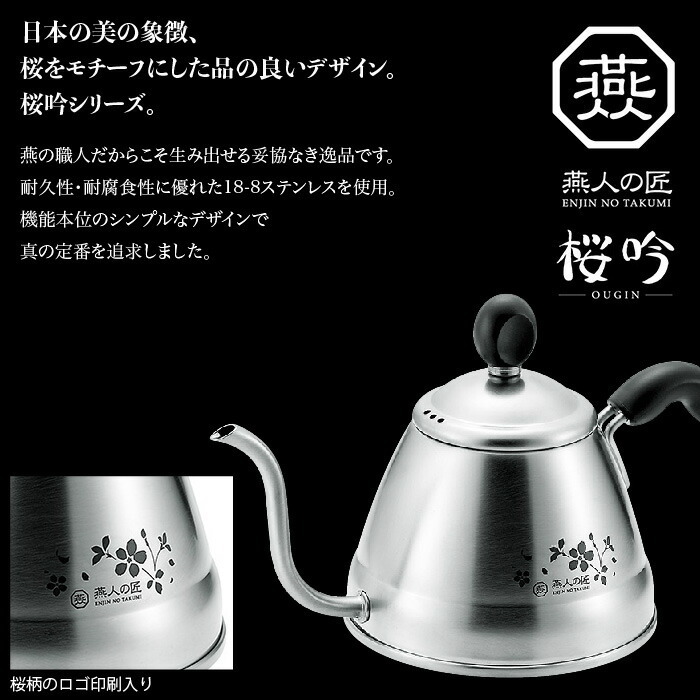 | 日本の美の象徴、桜をモチーフにした桜吟シリーズのコーヒードリップポット。 プロも納得のデザインと機能性。 コーヒードリップポットは細口で注ぎやすくなっています。 IH 200V、電磁調理器対応。 安心の日本製。 |