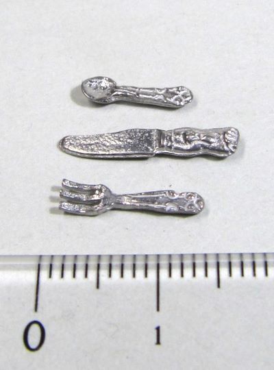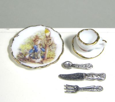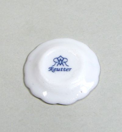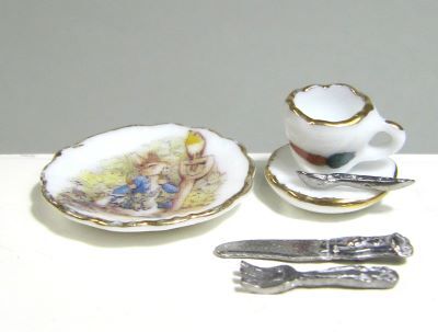 12分の1ドールハウスサイズの陶器のカップ&ソーサー、ケーキ皿、フォーク、ナイフ、スプーンのセットです。ケーキ皿の直径約2cm。陶器製品はドイツ製、金属製のフォーク、ナイフ、スプーンはイギリス製です。縁の塗り加減や模様の位置に個体差があります。ご了承ください。