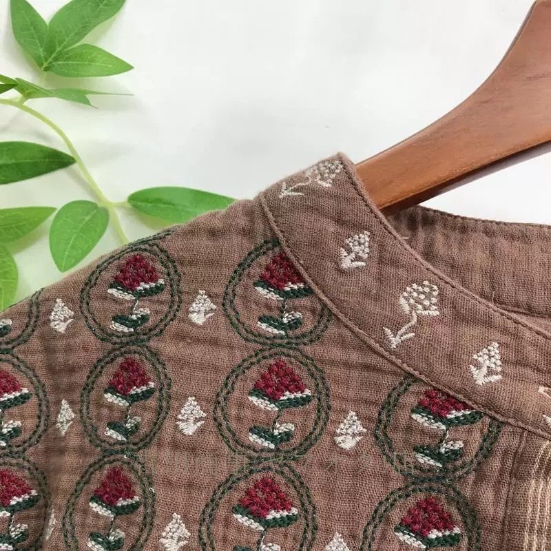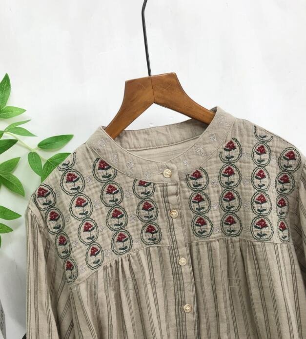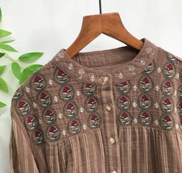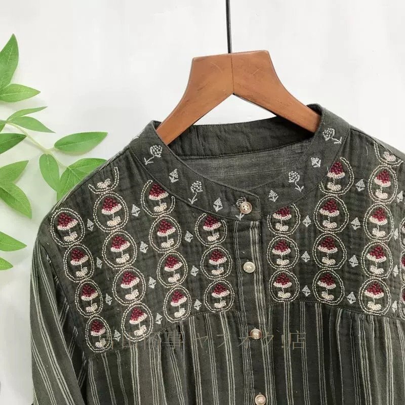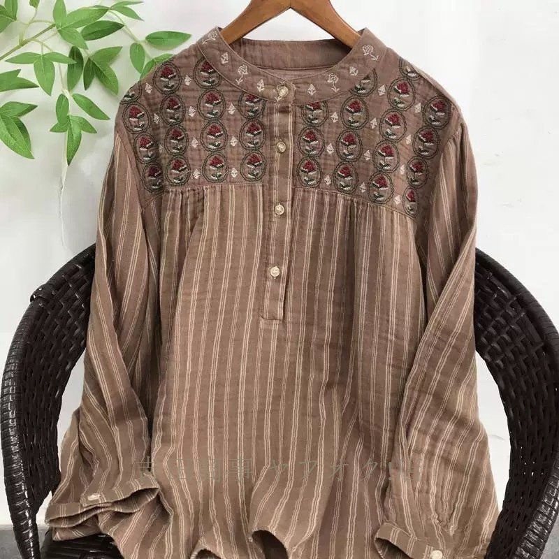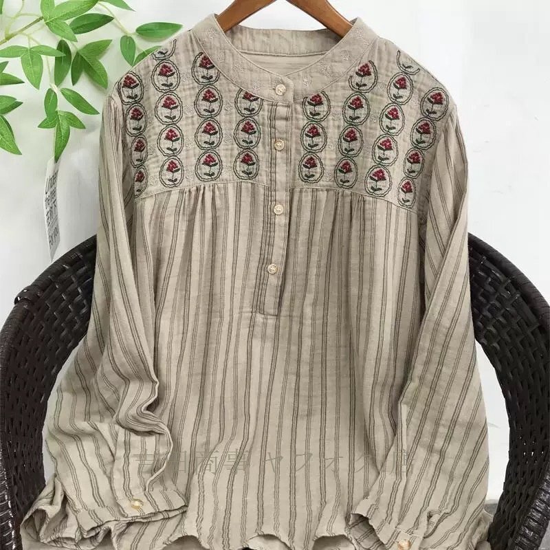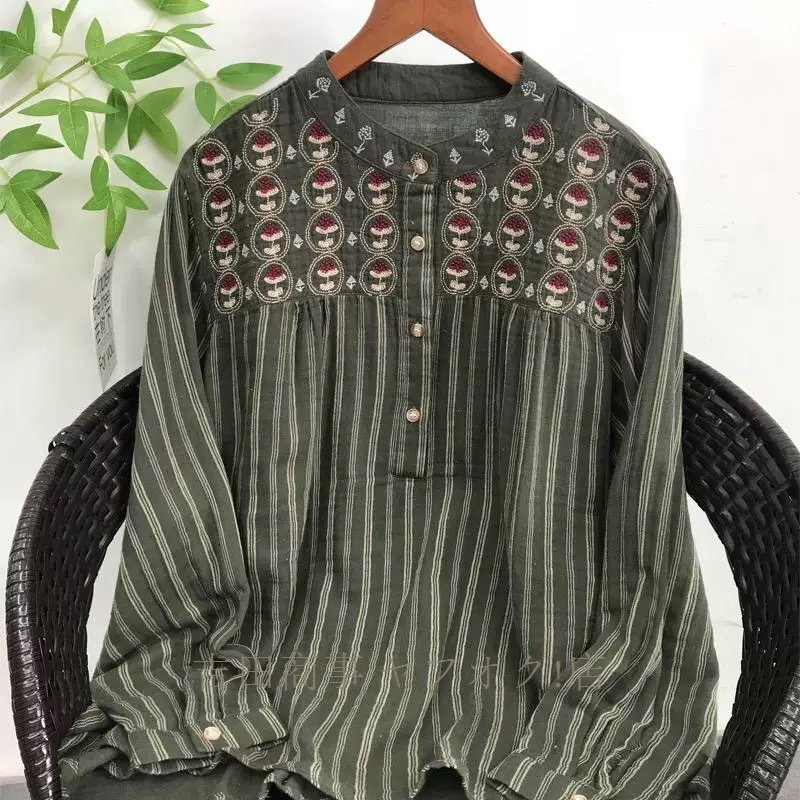 ★新品大チュニック ワイシャツ 襟も刺花柄 ダブルガーゼ ストライプ柄 綿100% コットン オシャレ フリーサイズ ナチュラル カラー