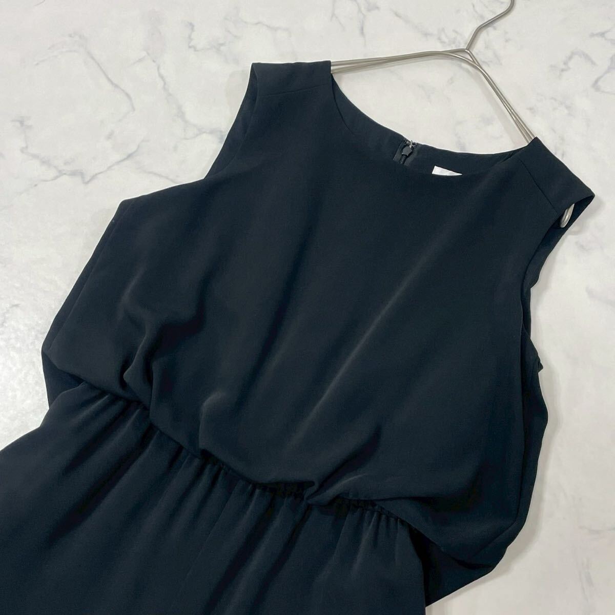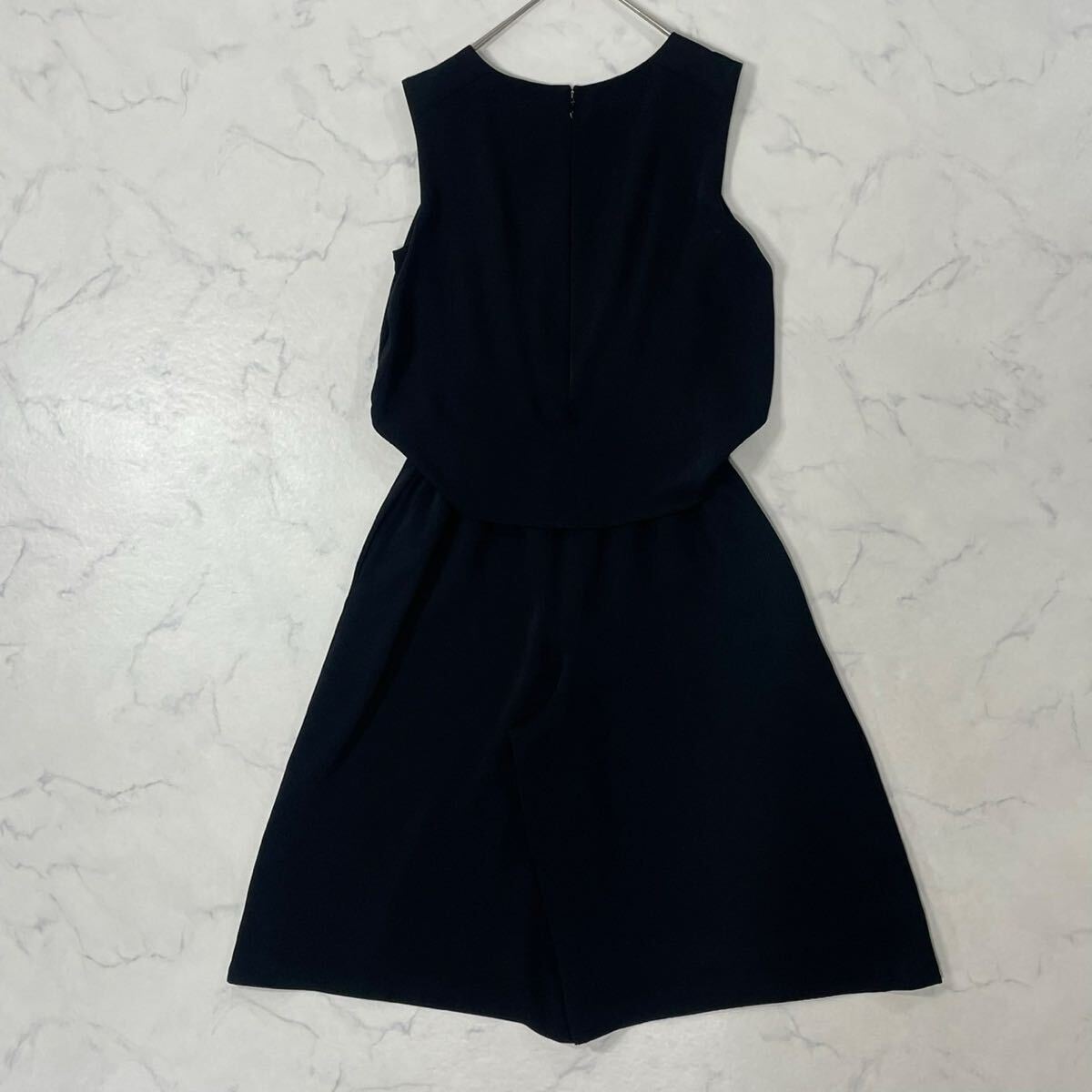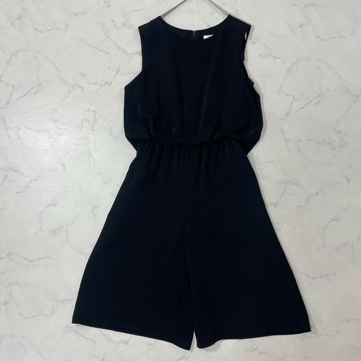 ワントーン 裏地付き ウエストゴム ジップ クルーネック ノースリーブ 七分丈 オールインワン