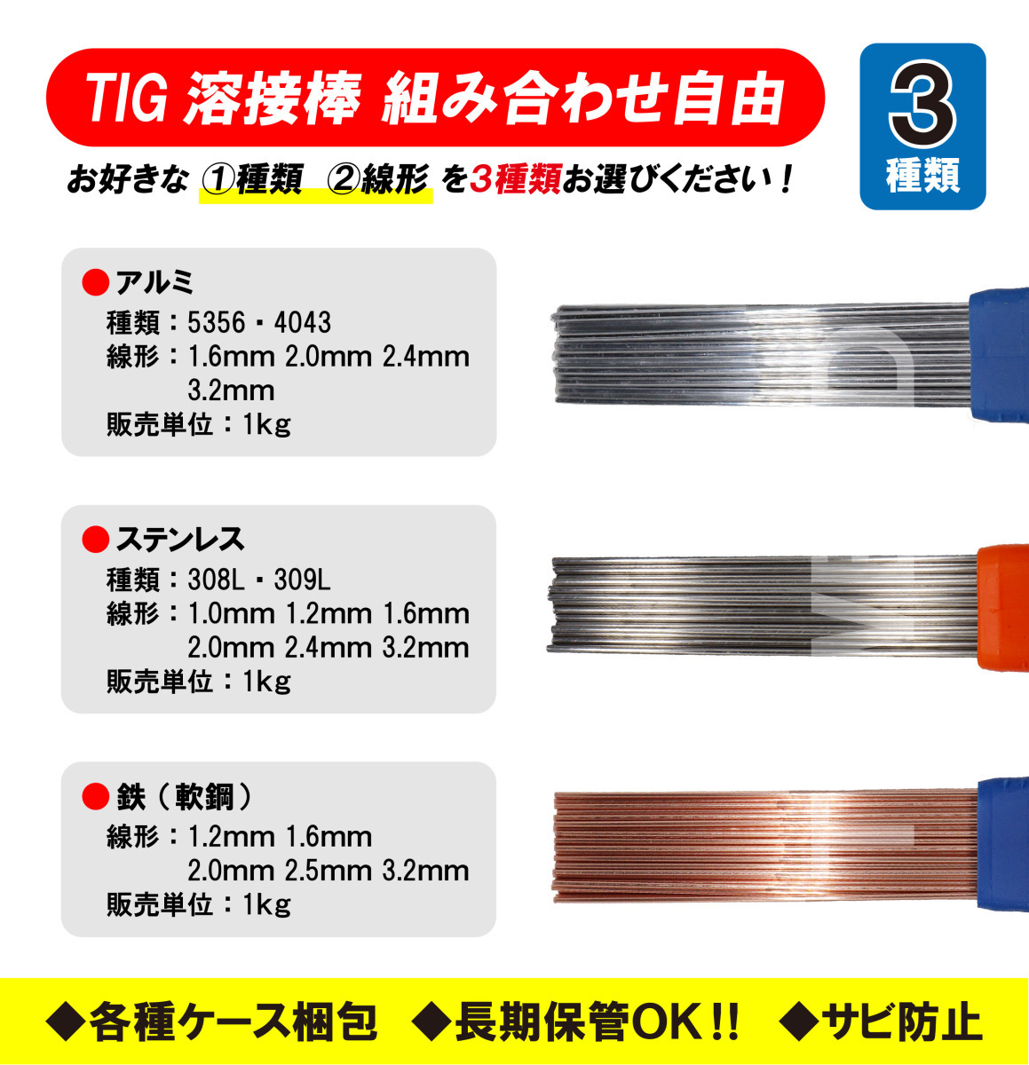 【組み合わせ自由!】TIG 溶接棒 ステンレス ( 308L 309L ) 、TIG軟鋼鉄棒、 TIGアルミ ( 5356 4043 ) 長さ:1m 3点セット
