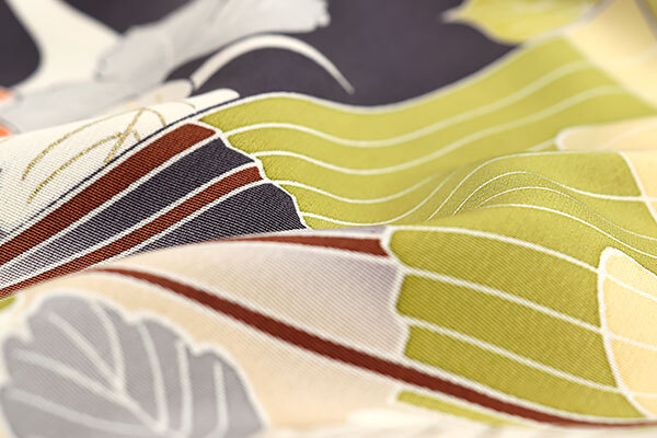 白色、ピンク色、水色、オレンジ色、薄グレー、菜種油色などのお色目で、流水に扇や菊、牡丹、萩、撫子、笹などの模様が染められ織ります。