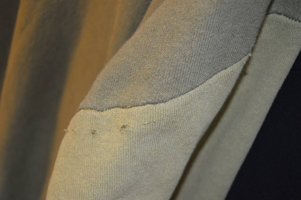 サンプルのタグ付き。袖が付け替えられ穴などの加工が施されています。