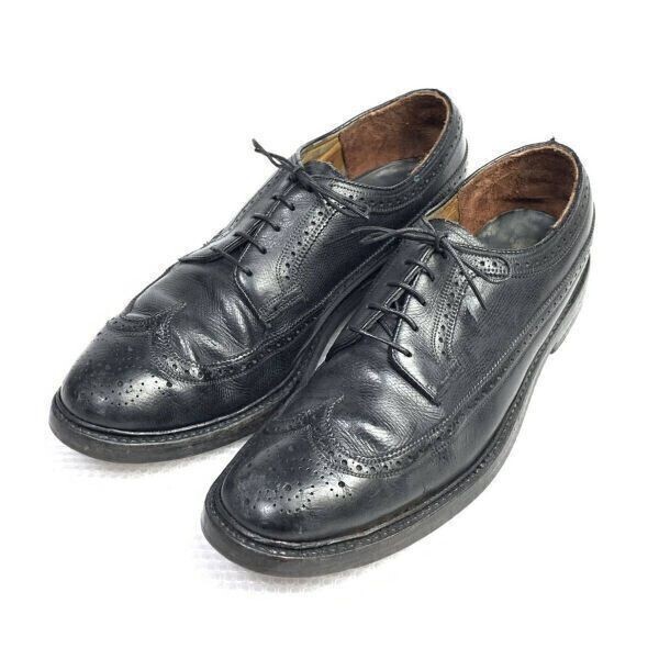 1970~80s? ビンテージ☆ブランド不明☆サイズ10 B☆26.5~27.5cm☆ロングウイングチップ アメリカンブローグ☆黒 ブラック△7-35