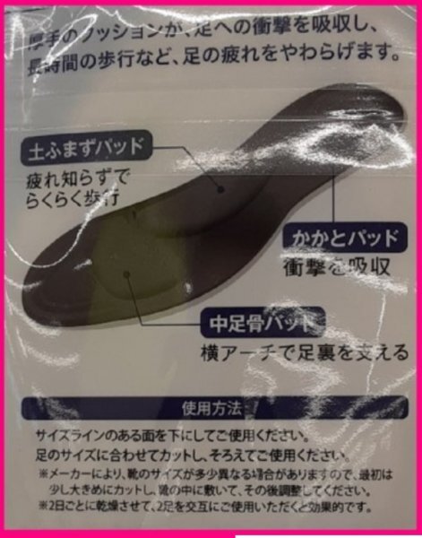 ・お好きなサイズをお選び頂けます。 1、メンズ:25-29cm 2、レディース:22-24.5cm (フリーサイズ:サイズに合わせカットできます) ★落札,お支払い後、取引ナビにて番号の連絡をお願い致します。 ・ワンランク上の履き心地 ・厚手のクッションが、足への衝撃を吸収し、 長時間の歩行など、足のつかれを和らげます。 【特徴】 :土踏まずパッド:疲れ知らずで「らくらく歩行」 :かかとパッド:衝撃を吸収 :中足骨パッド:横アーチで足裏を支える ・サイズ:フリー:メンズ:25-29cm or レディース:22~24.5cm (サイズに合わせカットできます) ・未使用/新品 ★★ お得情報 ★★ :いろいろなセットもございます。 (入札前に、ナビにてご質問して頂ければ対応可能です)) ・気になるところがありましたらご質問してください。 (色柄デザインなどが多少変更になることは御座います) (色はおまかせになる場合もございます:ご了承お願い致します) ・他にも出品中ですのでご覧下さい (^-^)。 まとめていかがでしょうか。 ・それではよろしくおねがいします。 |