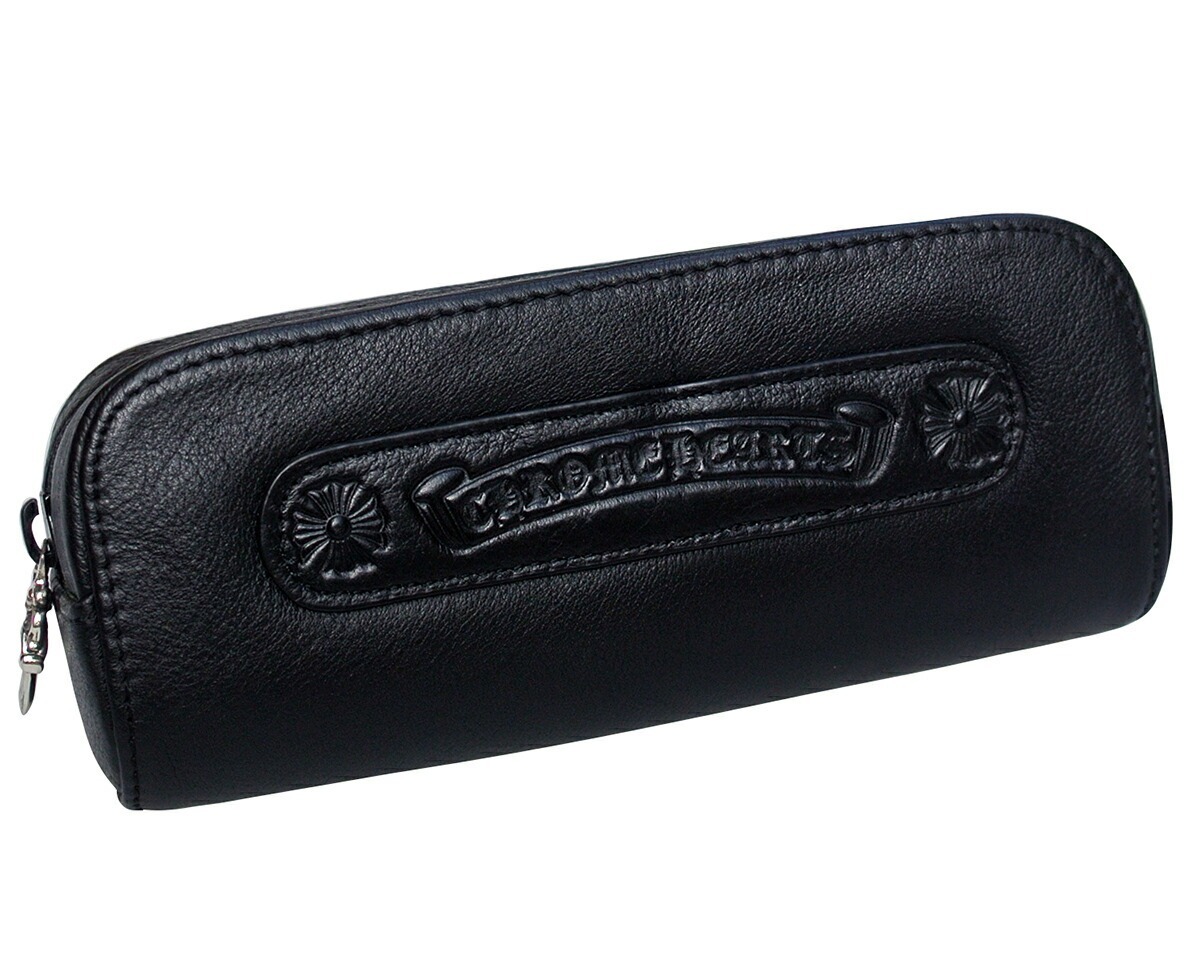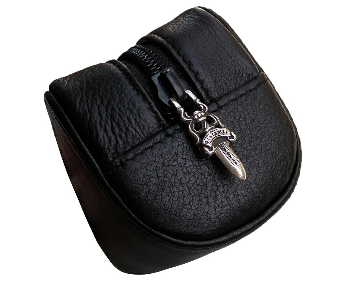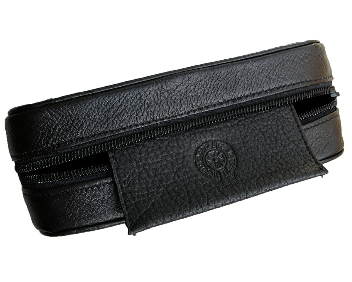クロムハーツ レザーポーチ/小物入れ です。上質牛革を使用。インナーはダガー柄のナイロンです。内側にはレザーのポケットが1つ付いています。ケースフロントにはクロムハーツスクロールロゴとクロス、内側のポケットにはクロスとホースシューがデザインされています。ジッパーはシルバーのダガーデザインです。お色は、ブラックです。サイズ:縦7.2cm、横18.5cm、厚さ6cm素材:ナイロン、レザー、925 Sterling Silver販売実績20年のクロムハーツ専門店です。お客様に満足して頂ける丁寧な対応を心がけております。