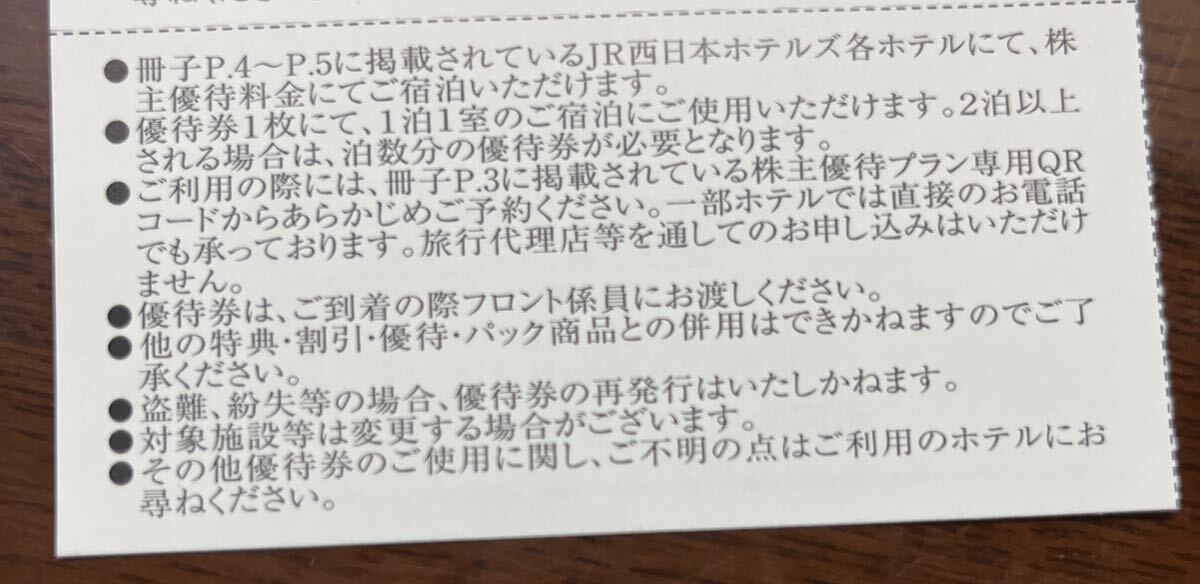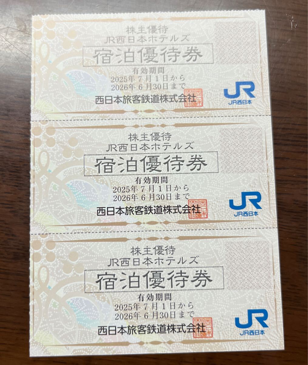 JR西日本株主優待券のJR西日本ホテルズの宿泊券です。3枚セットの価格となります。有効期限は2026年6月30日までとなります。