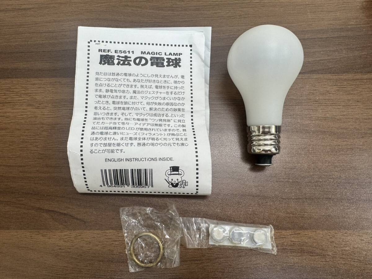 マジシャンや司会者、変わったおもちゃがお好きな人などには、うれしいギャグトリックです。見た目は普通の電球のようですが、電源につながなくても、お好きなときに明かりを点けることができるのです。例えば、電球を手に持ったまま、静電気を起こすジェスチャーや念力をかけるだけで電球が点きます。また、マジックがうまくいかなかったとき、電球を頭に付けて、何が失敗の原因なのか考えると、突然電球が点いて妙案を思いつき、マジックは成功する...といった演出もできます。他にも「ウソ発見器」に見立ててカード当てをおこなったり等々...アイデアは無限です。また電球全体が明るく光って見えますので部屋を暗くせず、普通の明かりの元でも演じることができます。