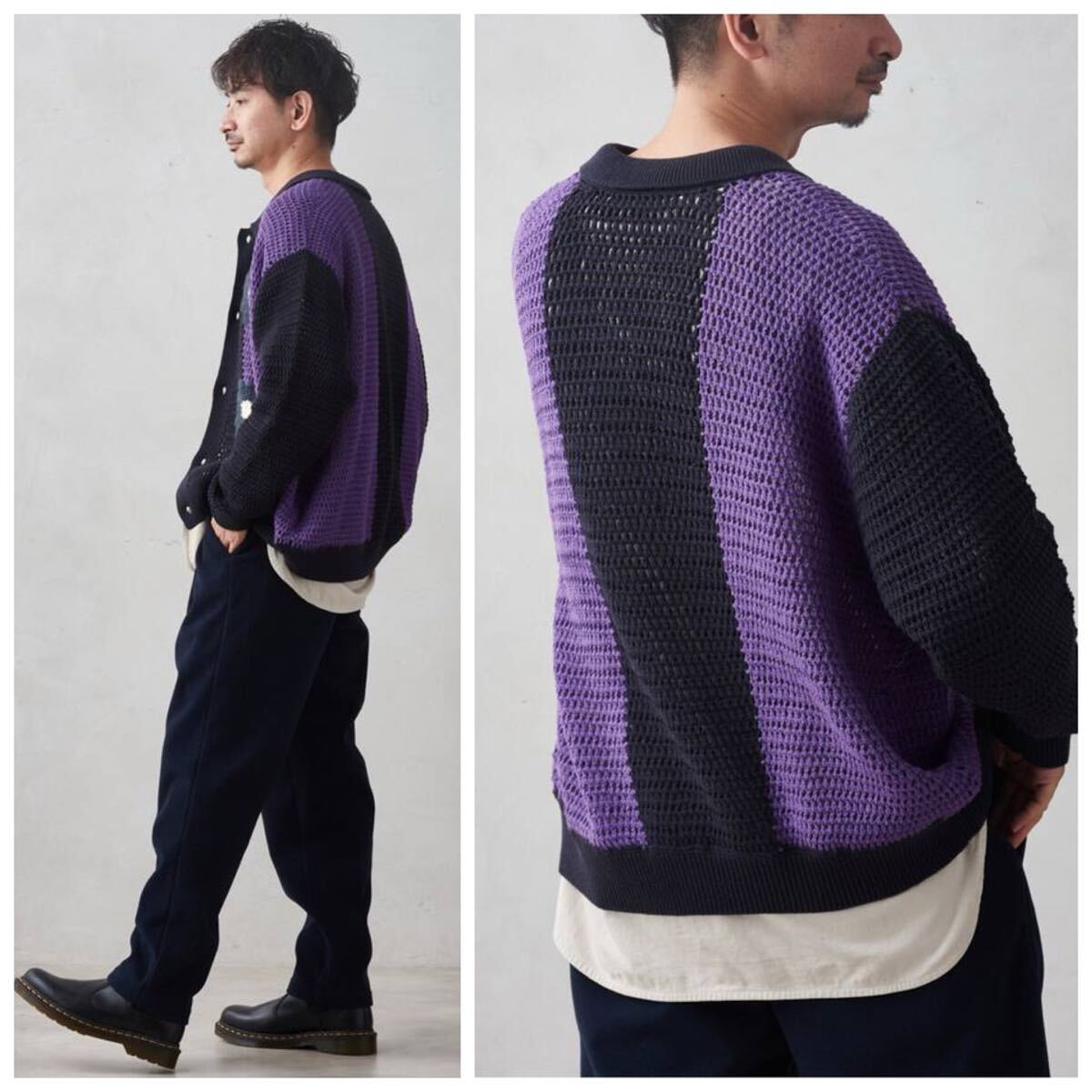 50年代のバイカラーシャツをサンプリングして作製した襟付きニットカーディガンです。