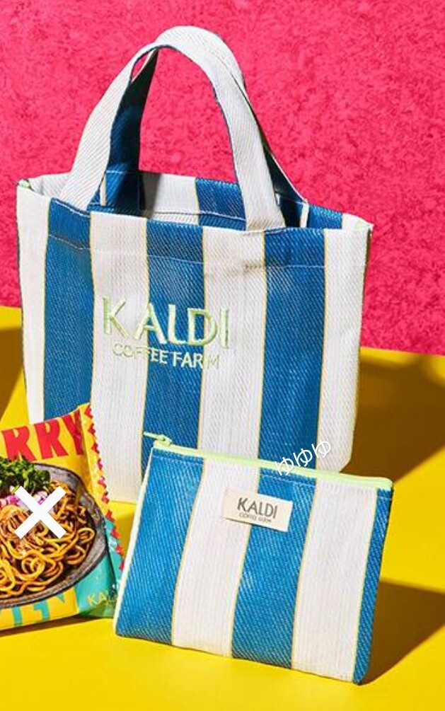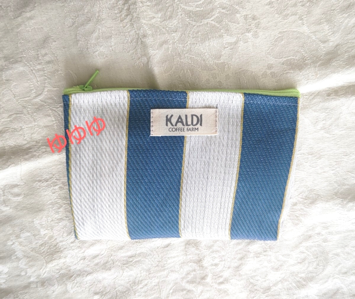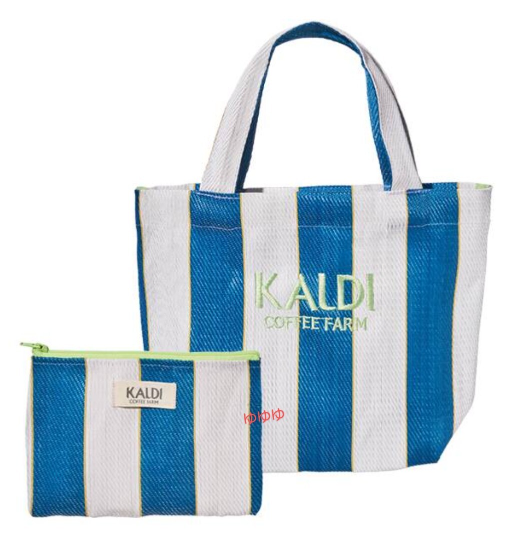 KALDI のロゴが入った、ストライプ柄のバッグとポーチのセットです。バッグは軽量でマチもあるので、お買い物バッグやちょっとした外出の際に便利かと思います。お揃い柄のファスナー付きポーチもついています(*^^*)