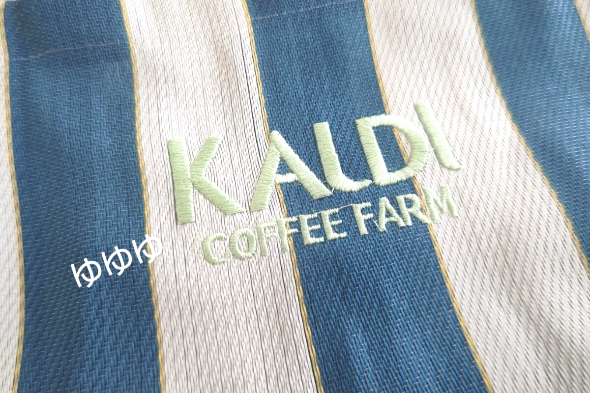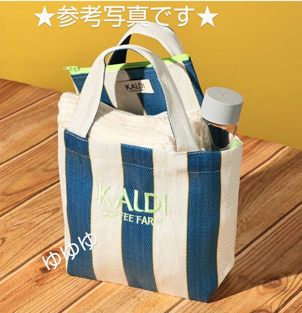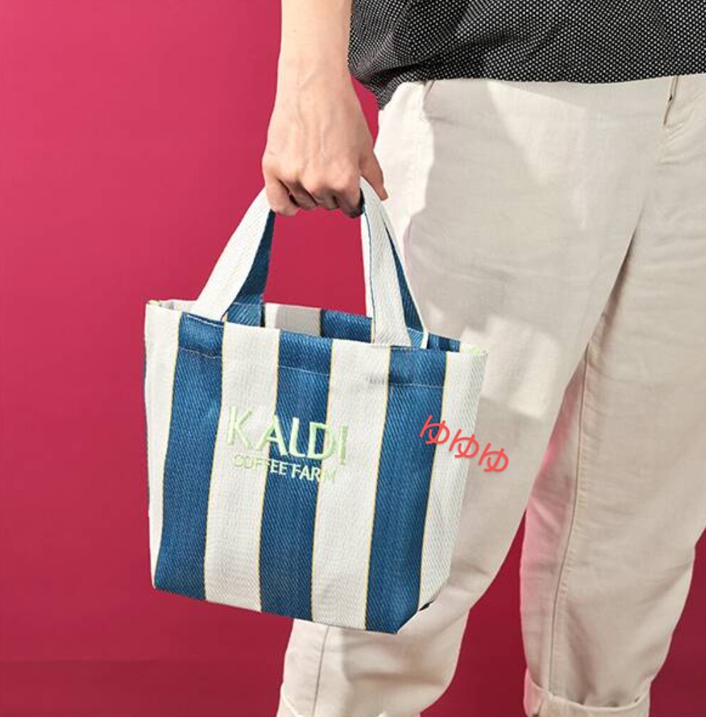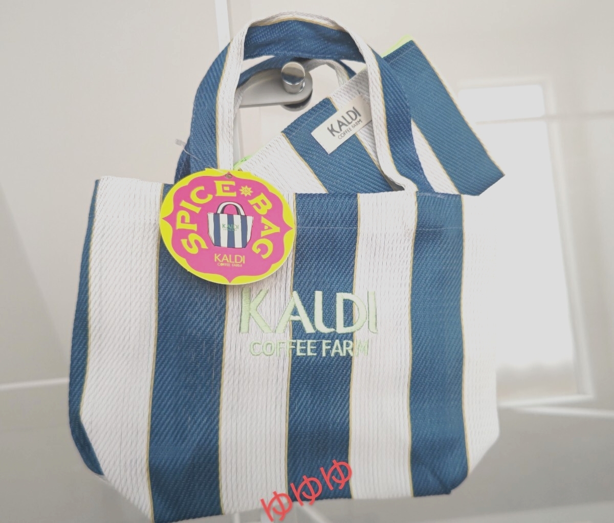 KALDI のロゴが入った、ストライプ柄のバッグとポーチのセットです。バッグは軽量でマチもあるので、お買い物バッグやちょっとした外出の際に便利かと思います。お揃い柄のファスナー付きポーチもついています(*^^*)