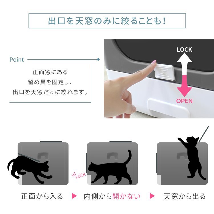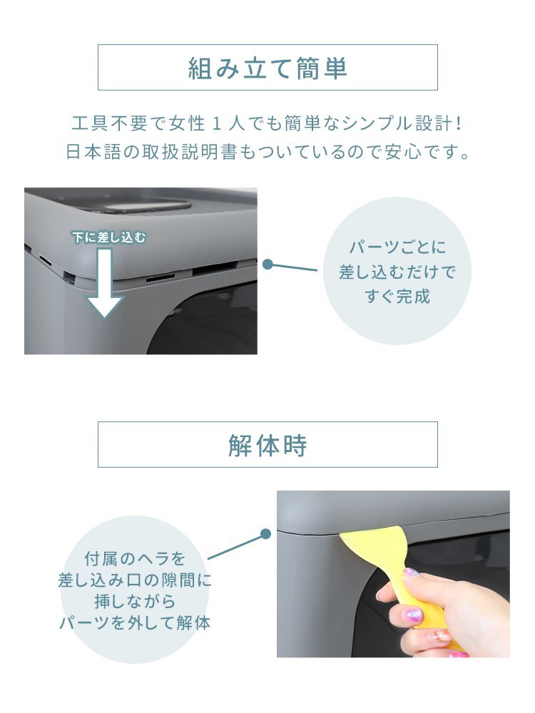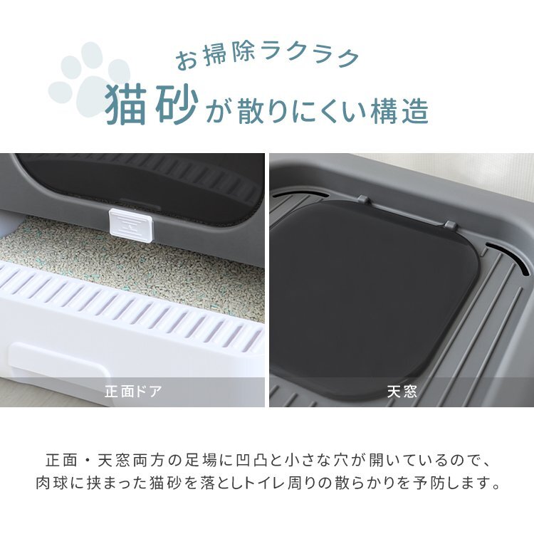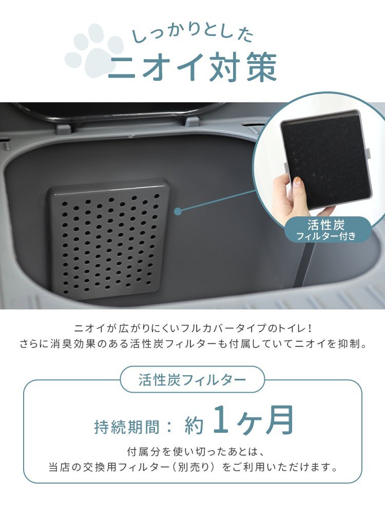 \ニオイが広がりにくい「扉付き」の猫用トイレ/ さらにニオイを抑える活性炭フィルターケース付で、ニオイ対策もバッチリ ねこちゃんは潜ったり登ったりが大好き。 横だけでなく、上の穴からも出られる構造! 遊び感覚で楽しみながらトイレを使えます。 お掃除には欠かせない、専用のスコップが付きで使わない時は本体に掛けて収納可能 【商品仕様】 ・カラー:グレー ・サイズ:(約)幅40×奥行44×高さ39cm ・重量:(約)2.7kg |
