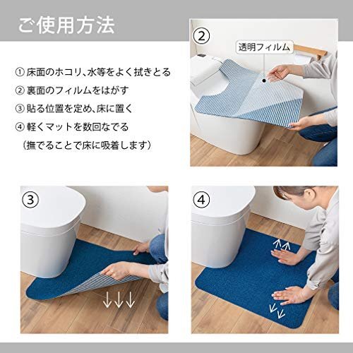 ブランド:Nico(ニコ)カラー:ミントグリーンサイズ:55×60×0.4cm表面はループ状になったカーペットや絨毯のような肌触りの生地を使用したトイレマット裏面には、吸着加工を施しているので置くだけでマットは動きません掃除機や粘着ローラーを使っても吸い上がらない吸着力。マットが動いて、危ないという心配がありません軽くて薄いタイプで、段差を感じにくく、足が引っかかったり、つまずいたりする心配がありませんはっ水加工で水分が拭き取れますアンモニア消臭加工床暖房にも対応(推奨:低温)汚れたら、繰り返しお洗濯可能サイズが合わない場合は、ハサミでカットでき、ほつれません便器根元部分など、形が合わない場合でもカットすることでビッタリサイズになりますめくれ上がりにくいように、四隅が丸くしています日本製サイズ:幅55×奥行き60cm(厚み)0.4cm