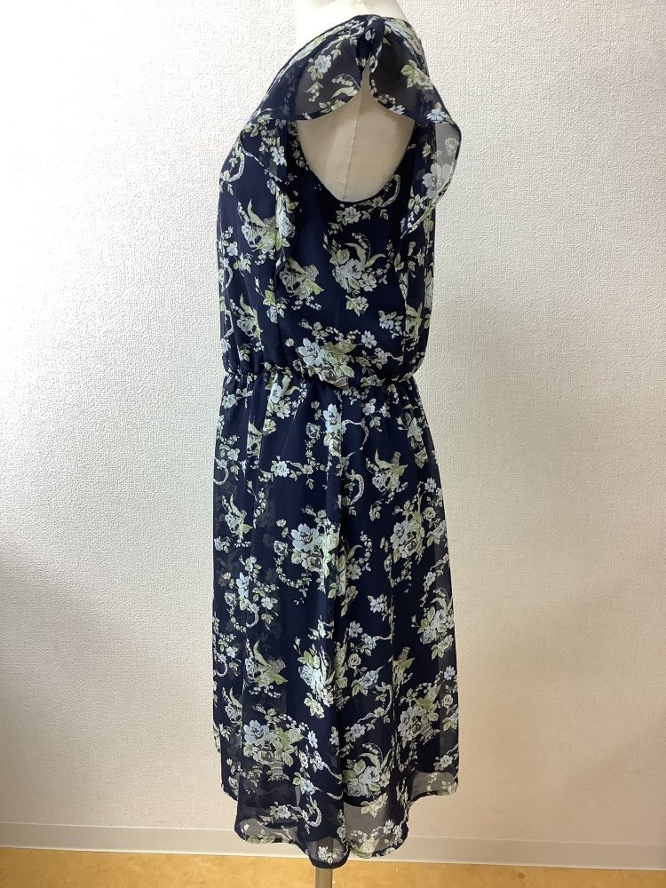 | 管理番号:10^132729  axes femme ネイビーにブルー系花籠プリント シフォンワンピ ウエストゴム 表示サイズ:M 実寸(参考)