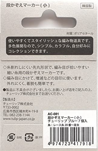 ブランド:チューリップ(Tulip)カラー:ブルー靴下編みやレース編みなど、細い糸で編む時にも邪魔になりません。やわらかくしっかり止まり、付け外しもカンタンです。従来商品よりも一回り小さく、薄くなりました。1袋7個入りかわいいチューリップの形です。サイズ約17mm×9mm厚み2mm7個入り