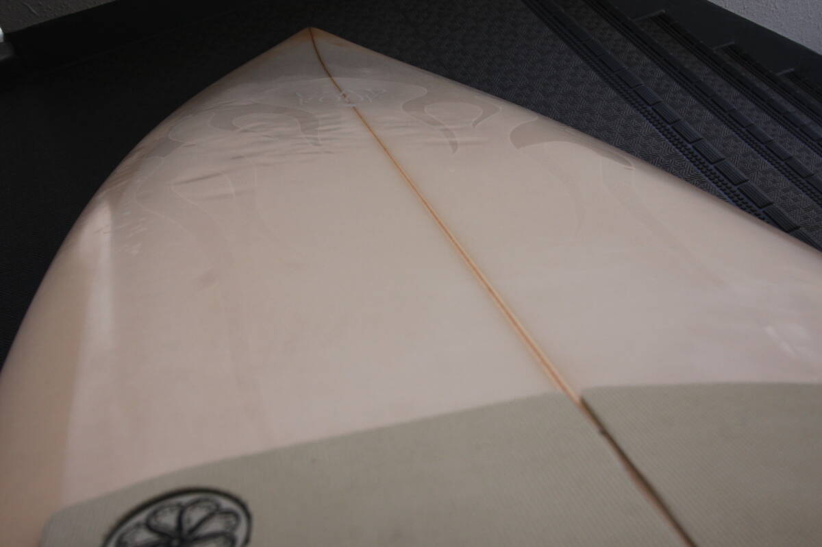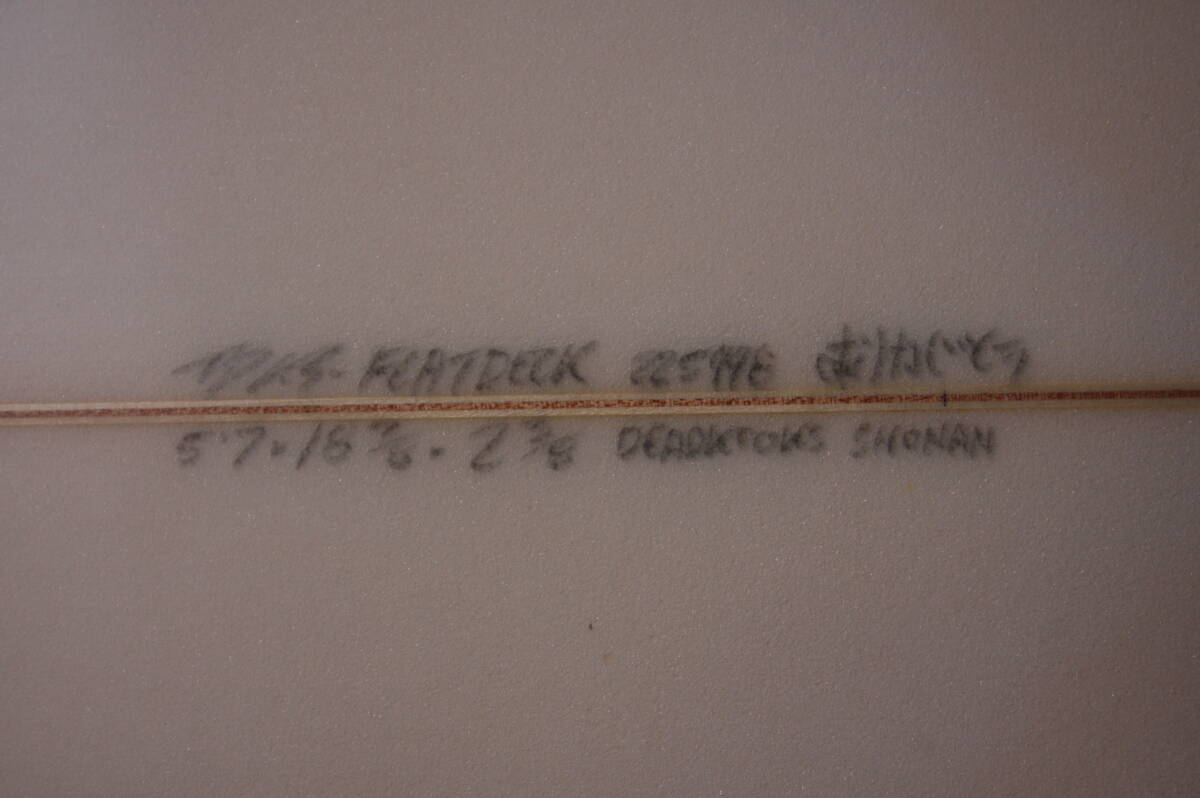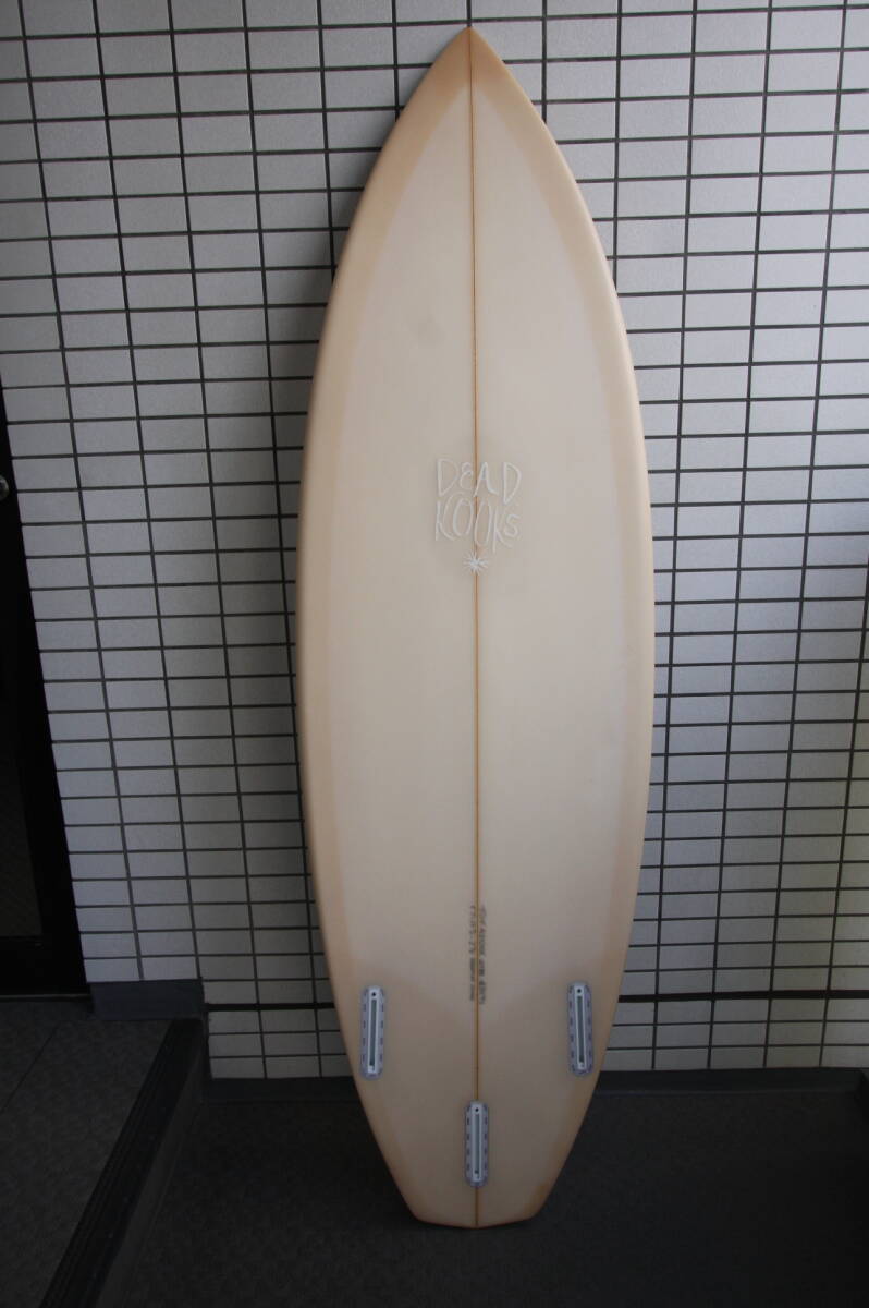 | ★中古美品★DEAD KOOKS デットクークス★FRATDECK THRUSTER フラットデッキスラスター 5'7 オーストラリアのニュ-ジェネレーションサーファー&シェイパーである、エイデン・ソウルによるブランドで、その確かなシェイプ技術とハイセンスなグラスワークに注目が集まる、今人気急上昇中のブランドです。そしてエイデンハンドシェイプのFRATDECK THRUSTERです。 80年代のアウトラインを採用しつつ現代的なボトムコンターなど幾つかの調整をおこないました。 ショートボードにおいて、テイクオフのスピードとタイトな小回りを実現するためにフラットデッキにドロップベベルレール、フラットデッキスラスターを融合しました。 その結果、テールがホールドされることなくボードの性能を十分に発揮できるようになり、幅広い条件下で波を捉えることが出来ます。 モダンパフォーマンスデザイン、ゆとりあるワイズのポイントノーズ、レールはボリュームを残したミディアムボキシーに、ボトムはシングル〜ダブル〜Veemに、テールはハードエッジなダイアモンドにそれぞれボードデザインされています。ロッカーはノーズはややミドル、テールはローにセットされ、フィンセットはFutureのトライフィンでセットアップされています。 基本パフォーマンスショートボードデザインながらもゆとりあるワイズと抑えたロッカーデザインによってスムースなテイクオフを可能とし、ワイドテールとシングルコンケイブによって加速性にも優れマッシーな波でもスピードに乗ったライディングを可能とします。またテールエリアのダブル〜Veeボトムにダイアモンドテール、バランスのとれたロッカーデザインによって、ボリュームを感じさせない軽快でアグレッシブなマニューバーを可能とします。 サイズ::5’7×18 7/8×2 3/8 (170.2cm×47.94cm×6.03cm) ボードコンディション::デッキはフットマーク少々程度、ボトムは凹みも全くないです。 デザイン::ベージュのティントで、デッキ面にクリアーでファイヤーパターンが入っています。 基本的には手渡し(横浜近辺、他地域は近くなら応相談です)時間を貰えれば着払いで営業所留めで発送出来ます。 美品ですが中古の為ノークレームノーリターンでお願いします。 | |||