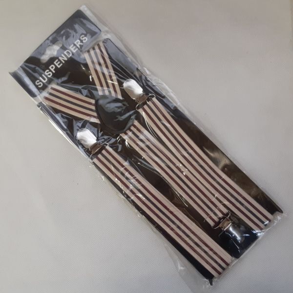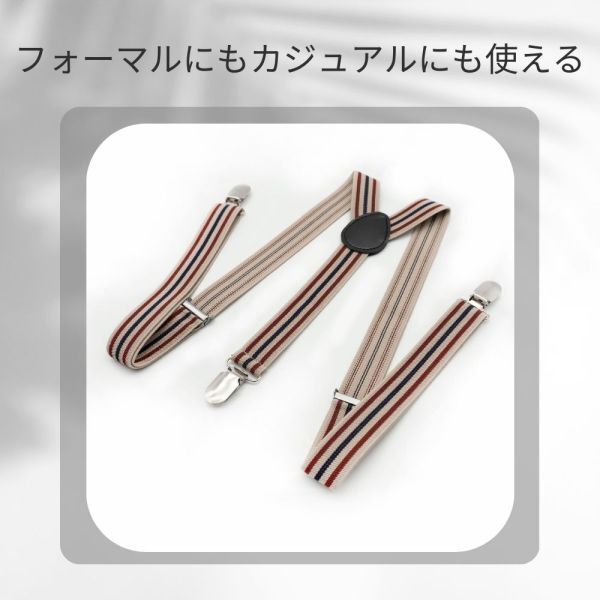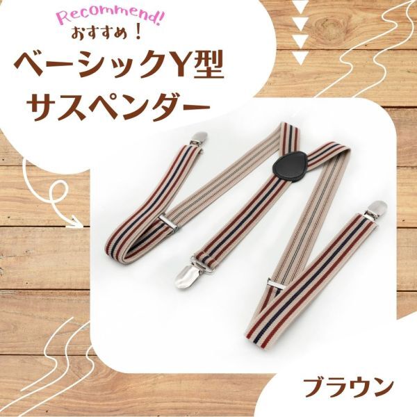 ブラウンのベーシックなY型サスペンダーです。フォーマルな場面での使用にも最適で、スカートやパンツのずり落ちを防ぐ機能があります。普段使いのファッションアイテムとしても、コーディネートのアクセントに役立ちます。幅2.5cmのサイズで、アジャスターにより身長に合わせて調整可能です。