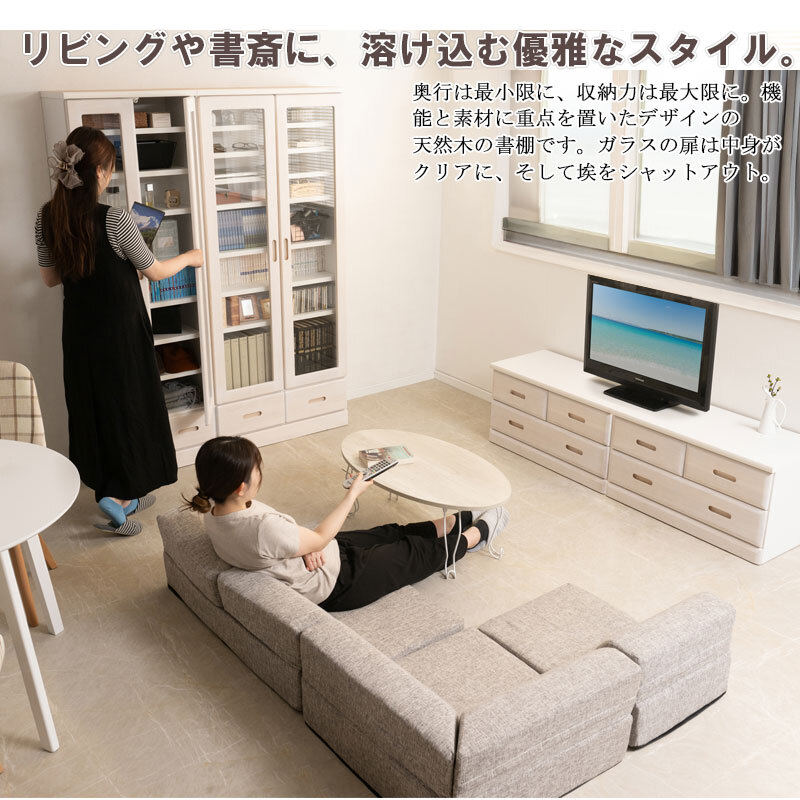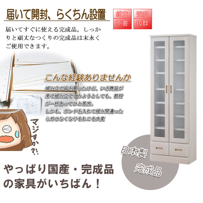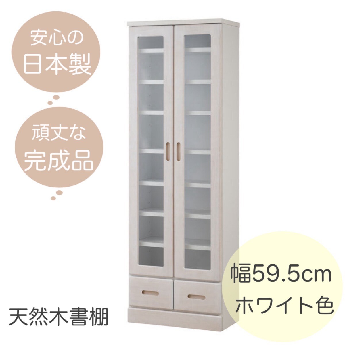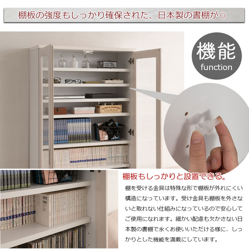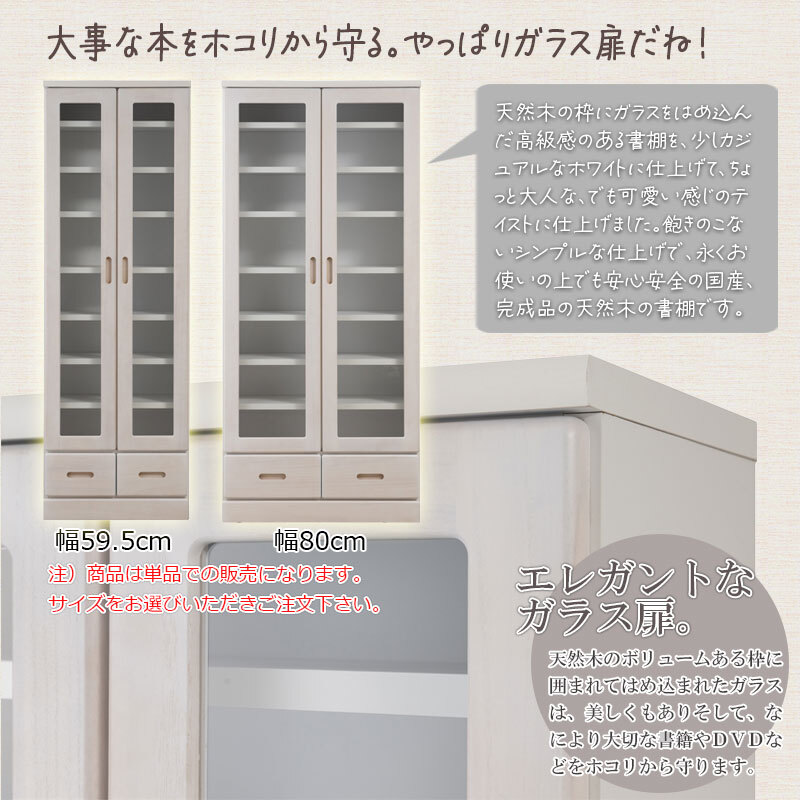 天然木の木の香り漂う本棚をホワイトカラーで仕上げた、お洒落な『メルシー』書棚シリーズ。天然木の枠にガラスをはめ込んだ高級感のある書棚を、少しカジュアルなホワイトに仕上げました。飽きのこないシンプルな仕上げで、永くお使いの上でも安心安全日本製、完成品の天然木書棚です。天然木のボリュームある枠に囲まれてはめ込まれたガラスは、美しくもありそして、なにより大切な書籍やDVDなどをホコリから守ります。棚を受ける金具は特殊な形で棚板が外れにくい構造になっています。受け金具も棚板を外さないと取れない仕組みになっているので安心してご使用になれます。細かい配慮も欠かさない日本製の書棚で永くお使いいただける様に、しっかりとした機能を満載にしています。引出しまで付いて使いやすい雰囲気のある本棚はガラスショーケースとしてもいい感じ。