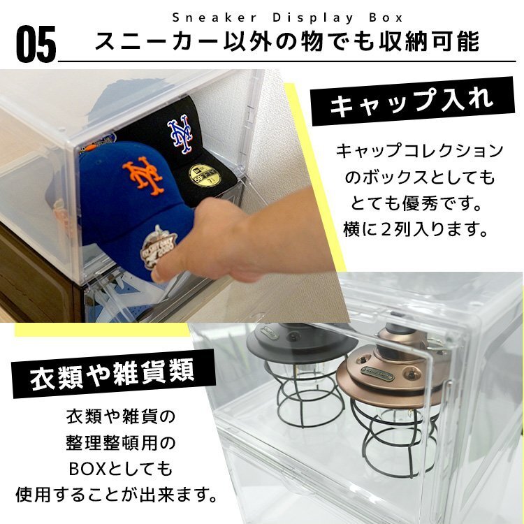 お気に入りのスニーカーをディスプレイして楽しめるシューズボックスです! メンズサイズやバスケットシューズ等のハイカットも靴にも対応!! 扉付き!クイック開閉!! 前扉にはマグネットがついており、開け閉めがスムーズです。 狭いスペースでもOK!スタッキングできます♪ 付属のパーツを使用することにより、倒れにくく安全に積み重ねて収納できます。 汚れたら濡れ布巾でサッと拭き取ればキレイ! 頑固な汚れには、丸ごと水洗いOKです! その他、キャップや雑貨、衣類などの収納や フィギュアやぬいぐるみのコレクションケースとしても使えます☆ 【商品仕様】 カラー:クリア サイズ(外寸):(約)幅36×奥行き28×高さ22cm (内寸):(約)幅34.5×奥行き27×高さ21cm 材質(本体):ポリプロピレン (扉):ポリスチレン 【商品内容】 ディスプレイボックス ×3個 |
