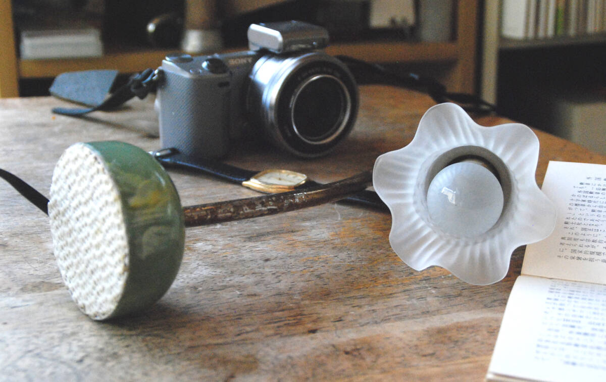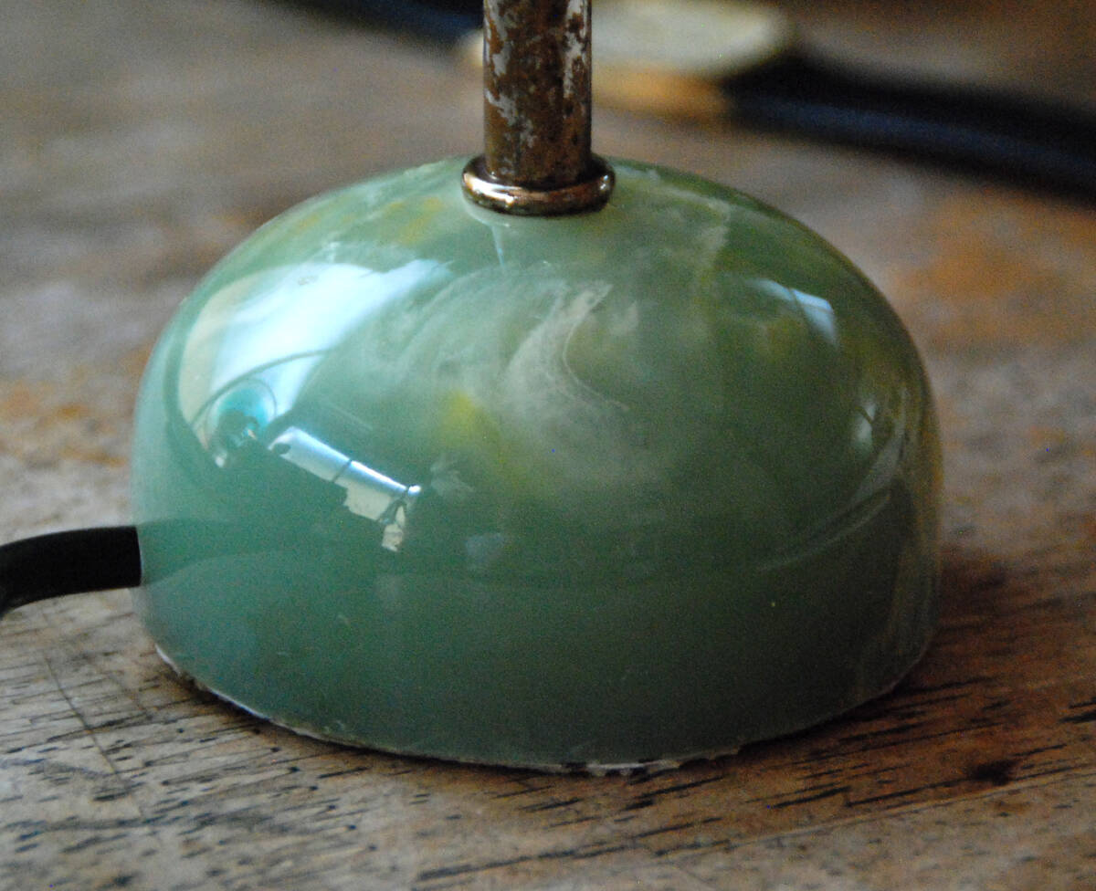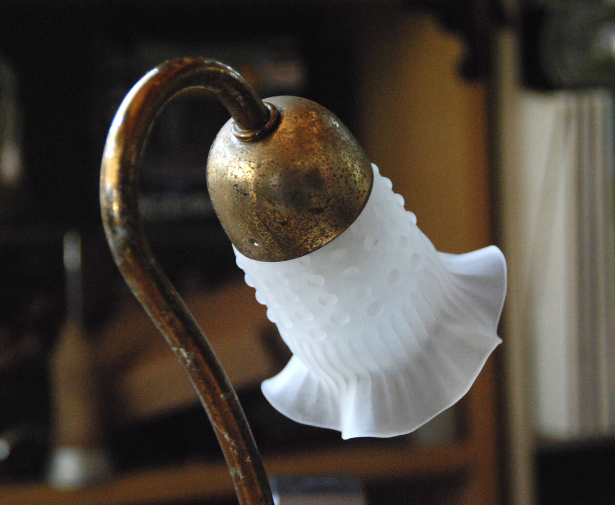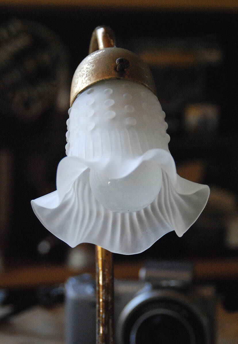 | * 商品説明 * アンティークな枕元スタンドです。高さは約24.5cm、底部の直径は約7cm、百合の花状の傘の最大径は約8.5cmです。一応クリーニングはしましたが、傘は白くキレイですが、アンティーク感があって、味があるとも言えますが、軸などにはサビや変色があって相当な経年感が有ります。台座は硬い石見たいですが、硬質プラスティックかも知れません。台座の底にクッションのような物が貼ってあってメーカー等は不明です。電球はE17口金で25W電球が付いています。126cm位のコードですが、スイッチが付いていませんので、写真のスイッチ付きコンセントをお付けします。本体とスイッチ付きコンセントのみの出品で、写っているカメラや時計等は付属しませんので、ご容赦下さい。是非お役立てください。 |