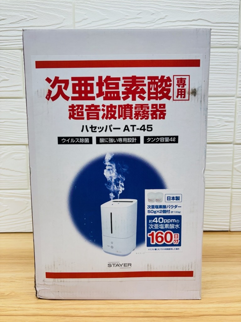 次亜塩素酸水用 上部給水型超音波噴霧器 ハセッパーAT-45次亜鉛素酸パウダー50g 2個付き・ノロウイルス、インフルエンザなどの感染症のリスクを軽減・空間の消臭・加齢臭を分解・誤嚥性肺炎のリスクを低減・ペット臭(獣臭)を分解・水に溶かすだけで次亜塩素酸水(30~50ppm)が簡単にできる・希釈不要・4〜5Lタンクには付属スプーンですりきり2杯・手指の消毒には2Lの水道水に付属スプーンすりきり1杯を混ぜて直接手に噴霧・まな板、包丁、食器、布巾の除菌には2Lの水道水に付属スプーンすりきり1杯を混ぜて噴霧・商品は国内産・内容量:30g
