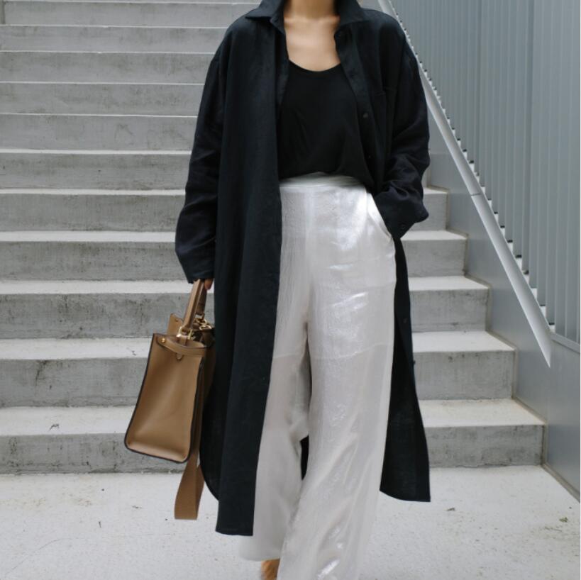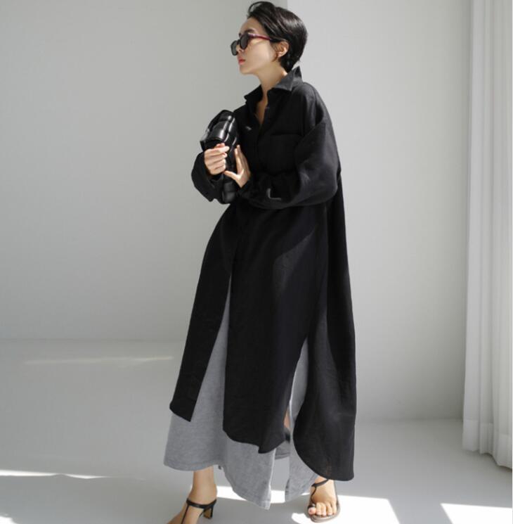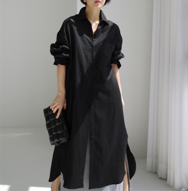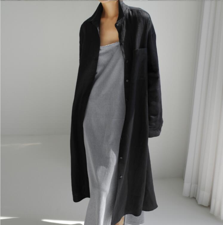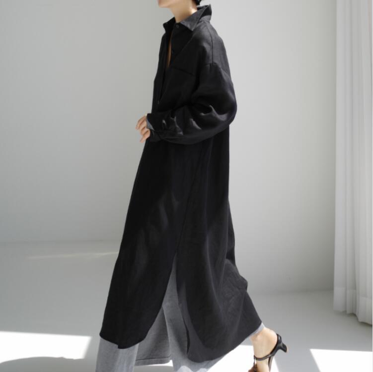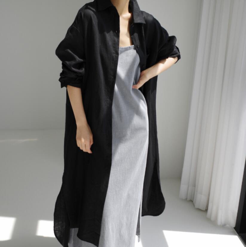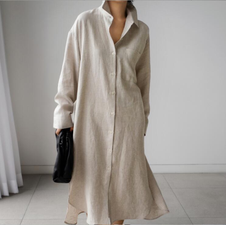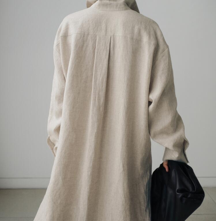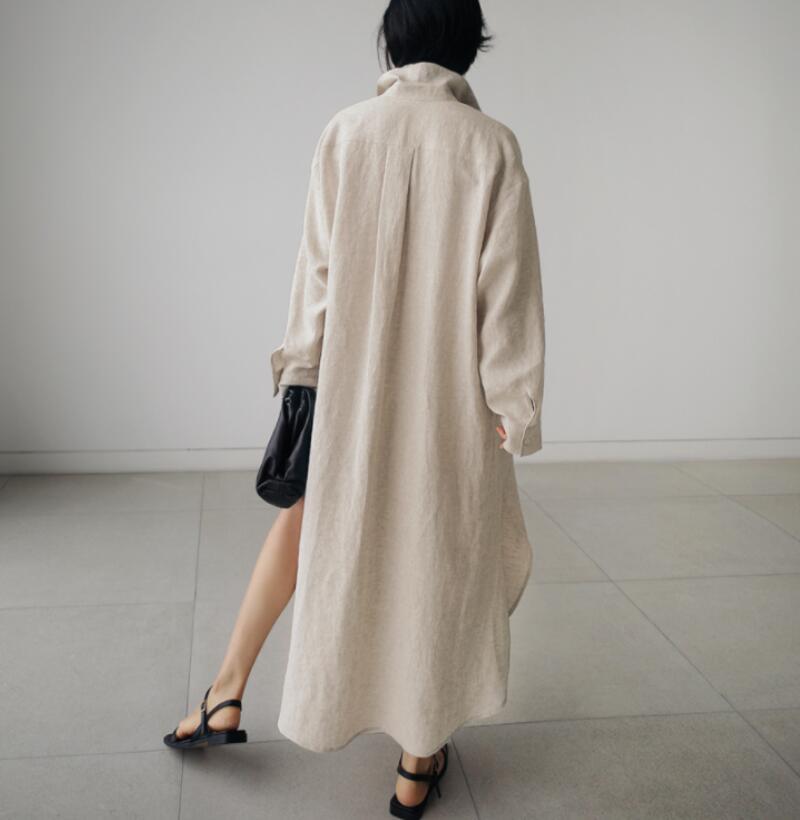 秋新作/シャツワンピース 綿麻 ロングシャツカーディガン ロングワンピース 無地 アウター 体型カバー 羽織 前開き ロングシャツ 長袖/杏
