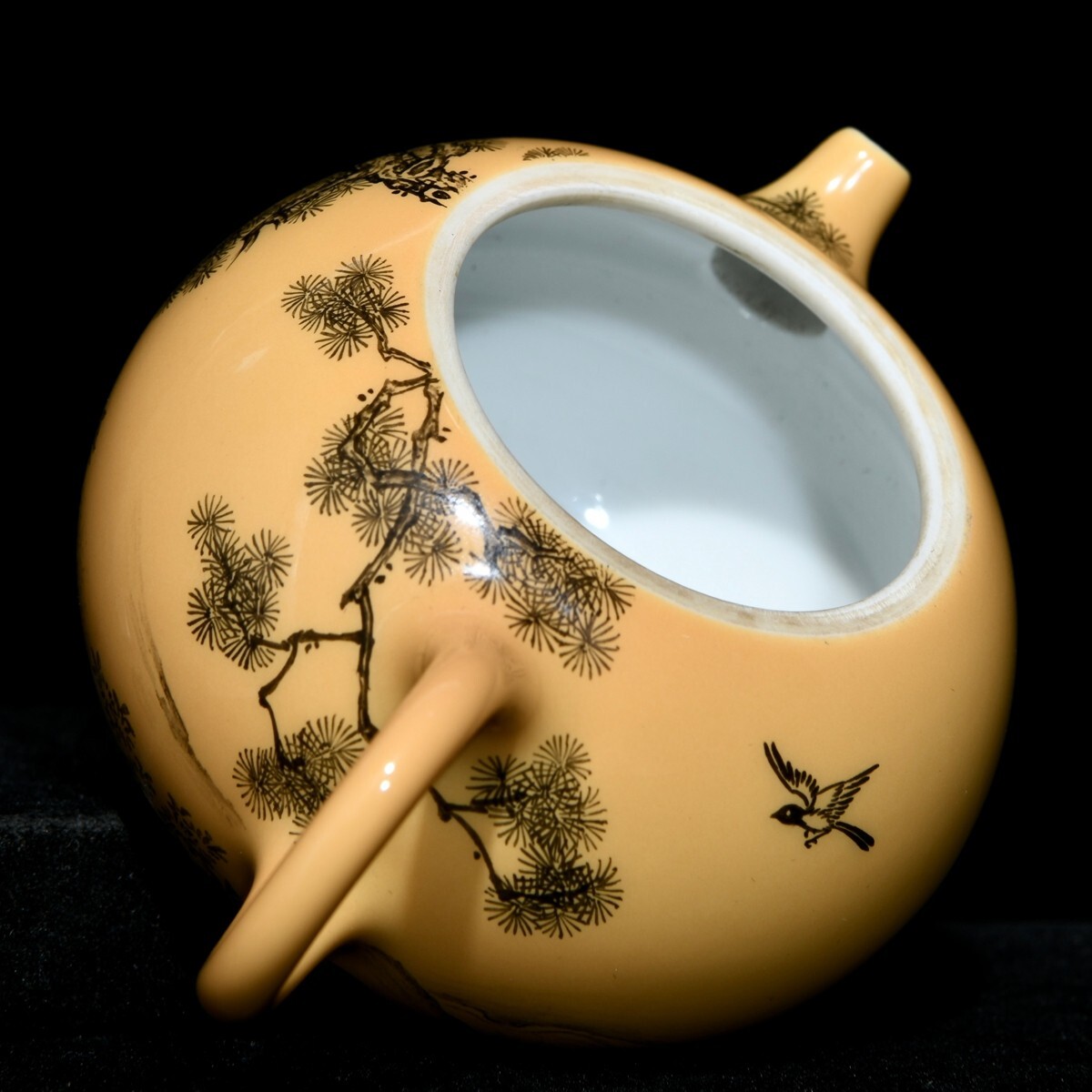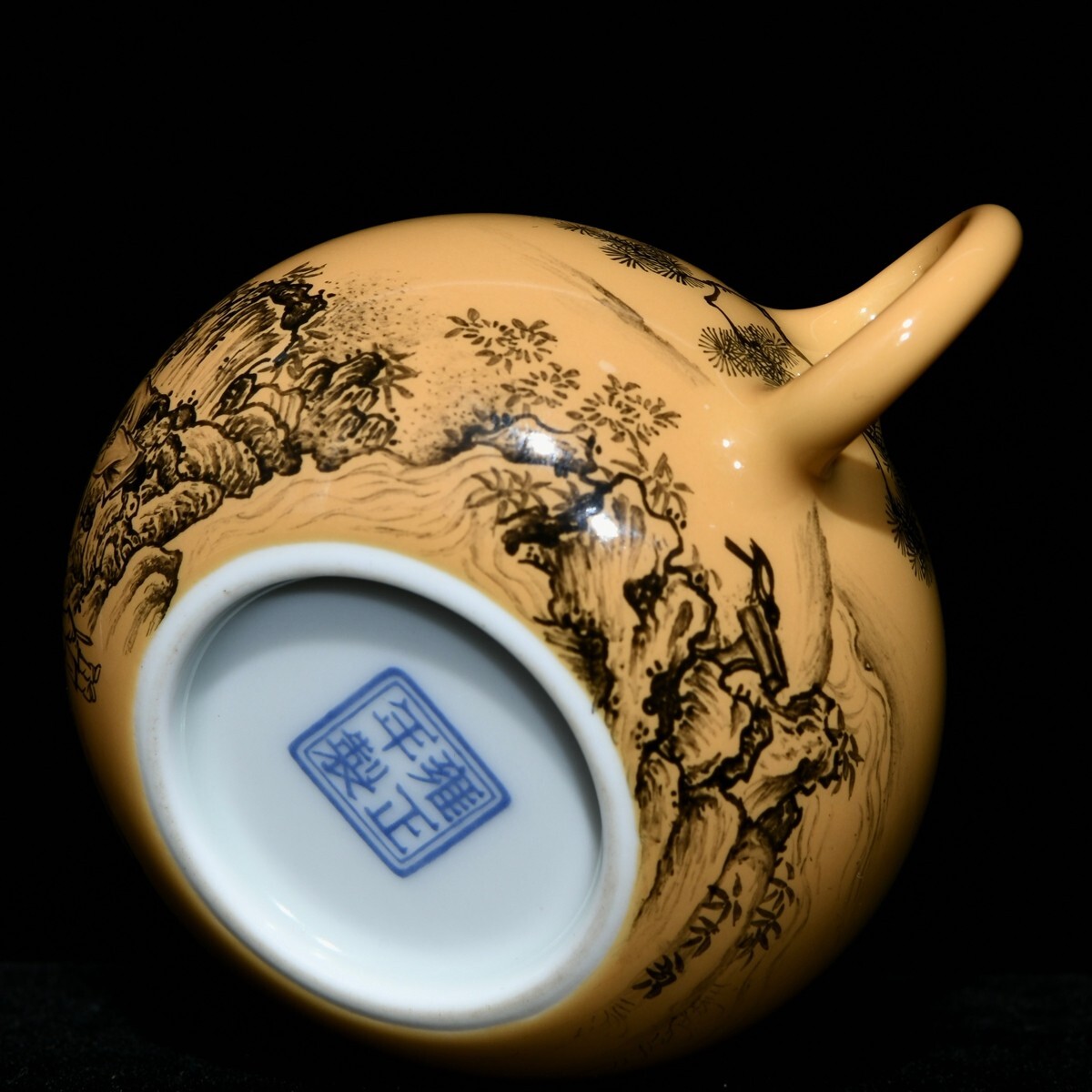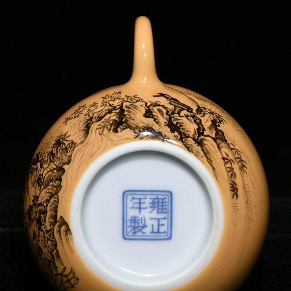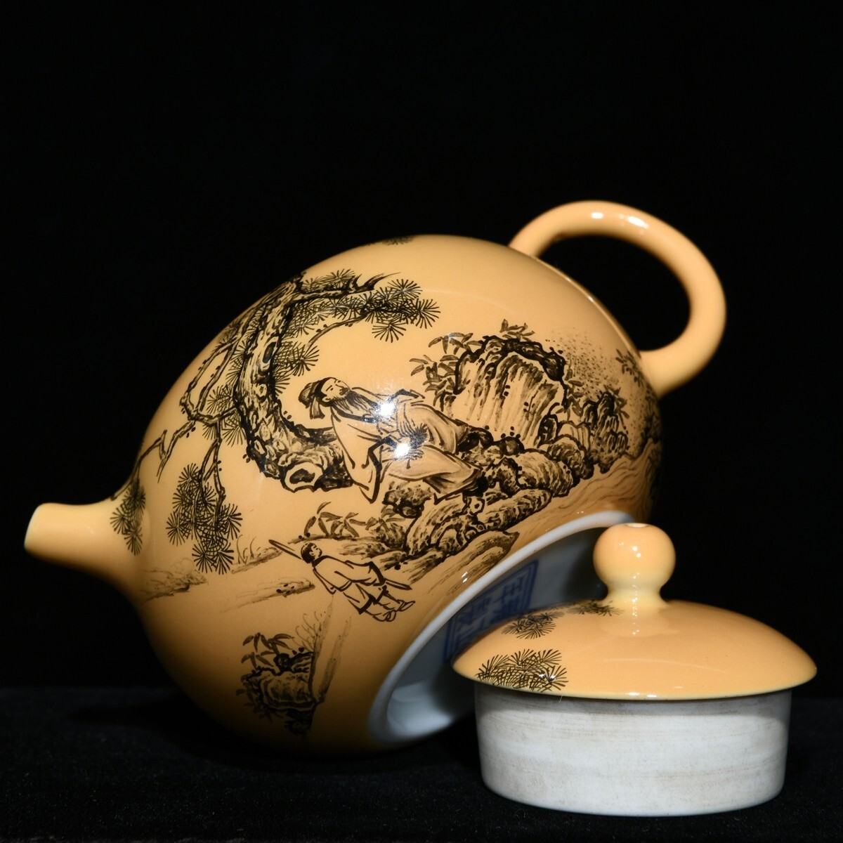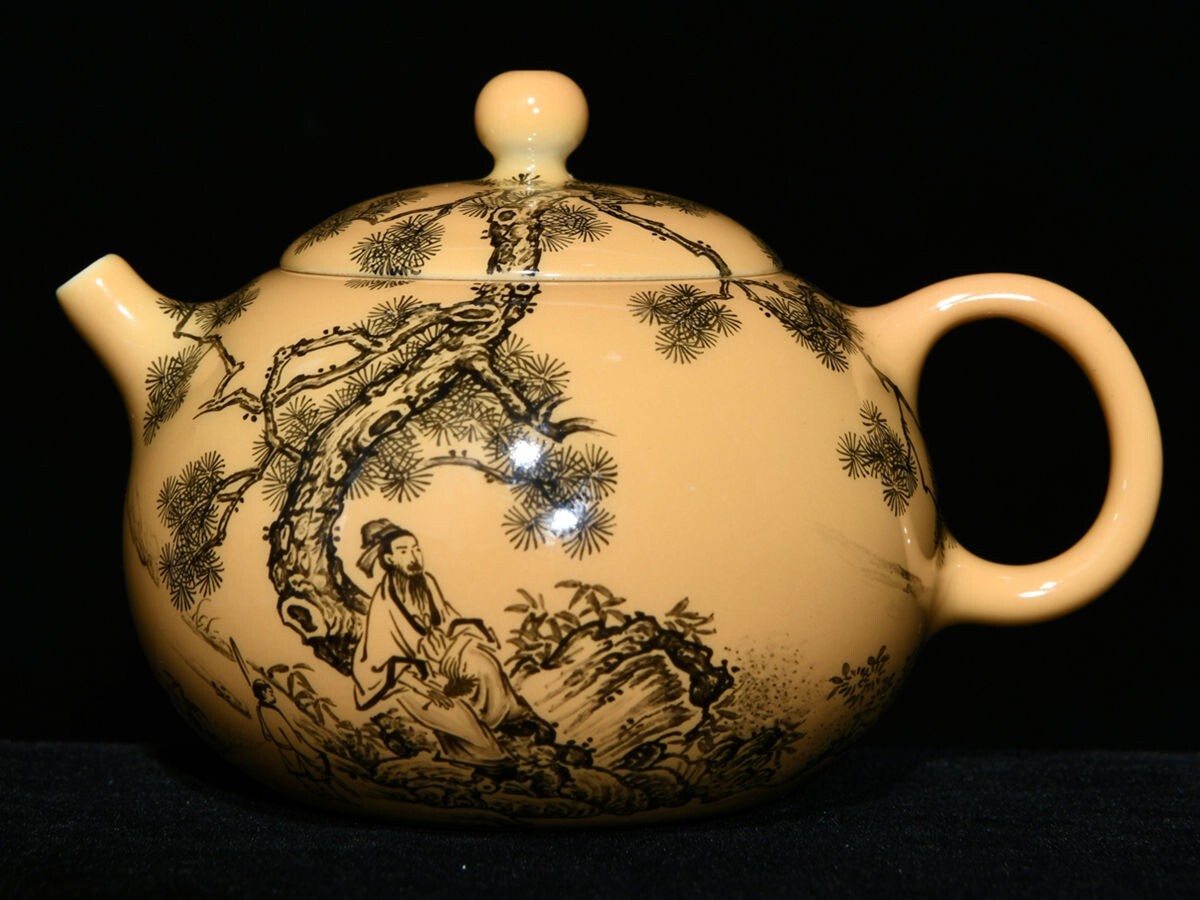 「清 雍正年製 陶磁器 米黄釉墨彩松下老人紋 茶壺」染付 置物 擺件 古賞物 中国古美術 旧蔵出