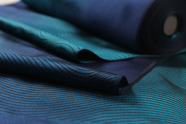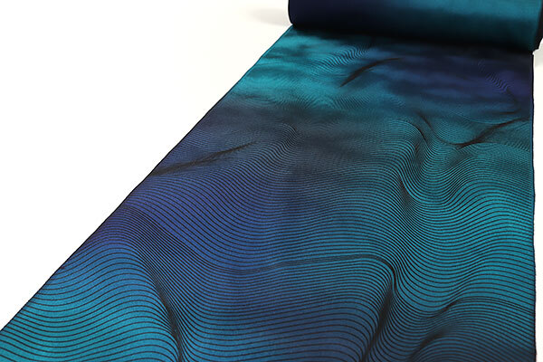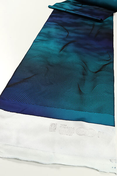 しっとりとした上質な丹後ちりめんの生地は、ロイヤルブルー、浅葱色のお色目でぼかし染めされております。生地には細かな斑の地紋が織り込まれており、やや光沢感がございます。