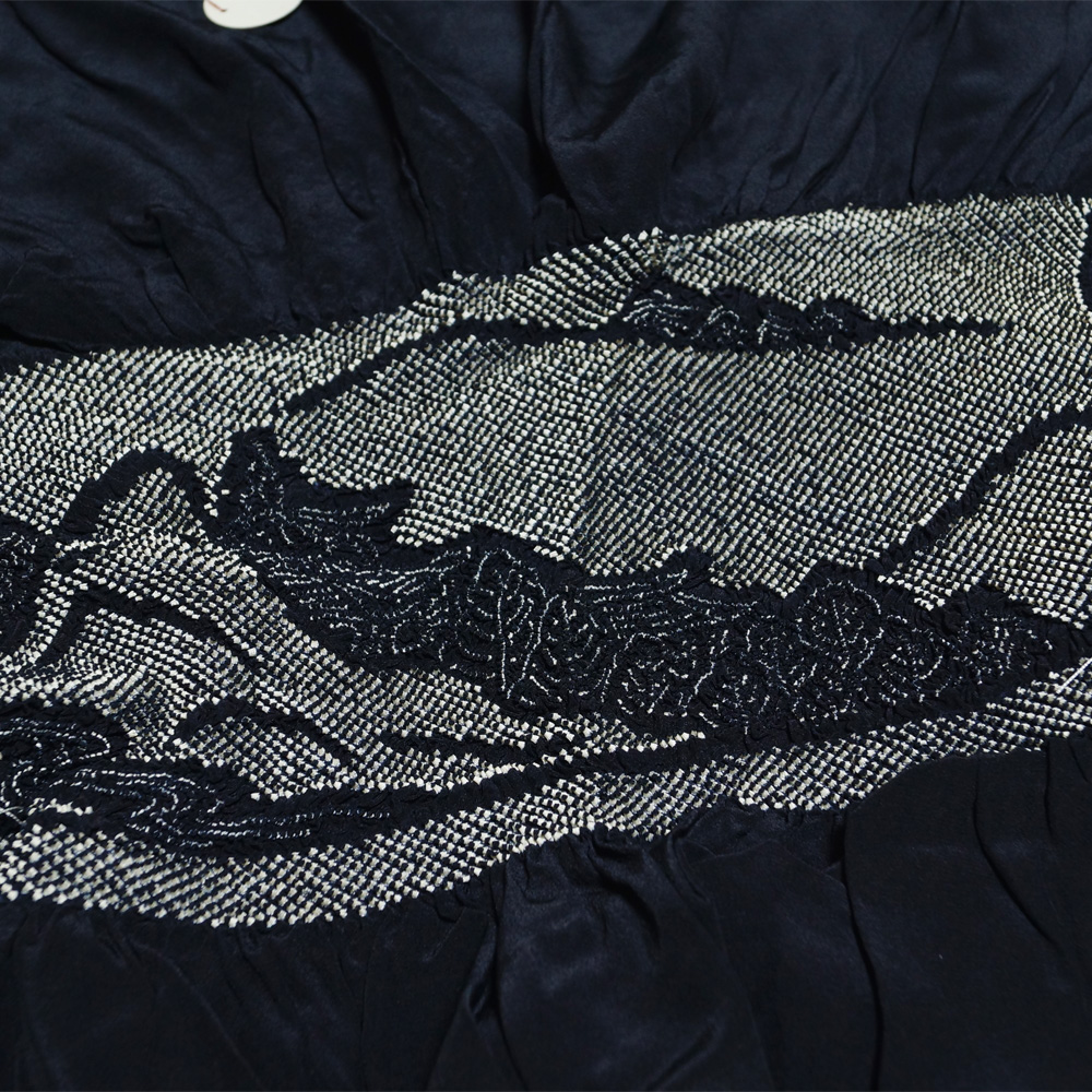 | 商品 説明 | 黒色系の地に両端に遠山に木立模様が絞り染めされた男性用の兵児帯です。 |