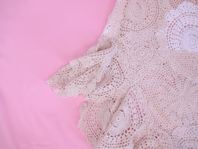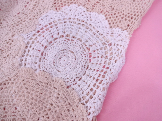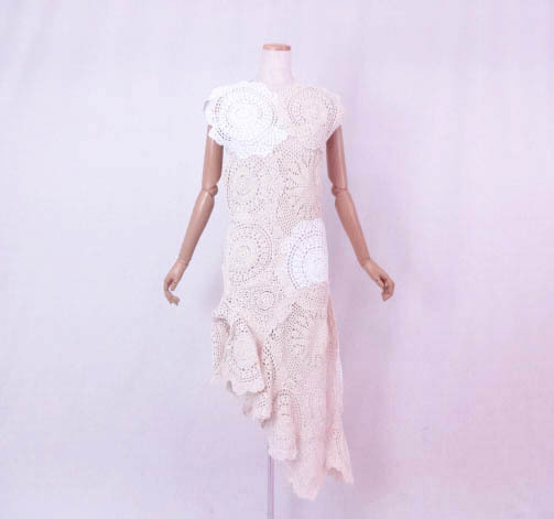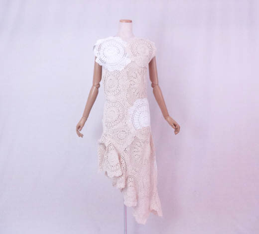 ナチュラルな風合いのクロシェニットのワンピース。フラワー柄をパッチワークのように重ねたデザインで、裾はフリルでアシンメトリーになっております。