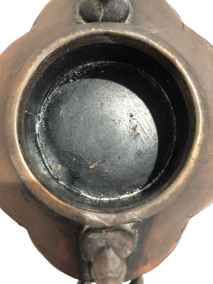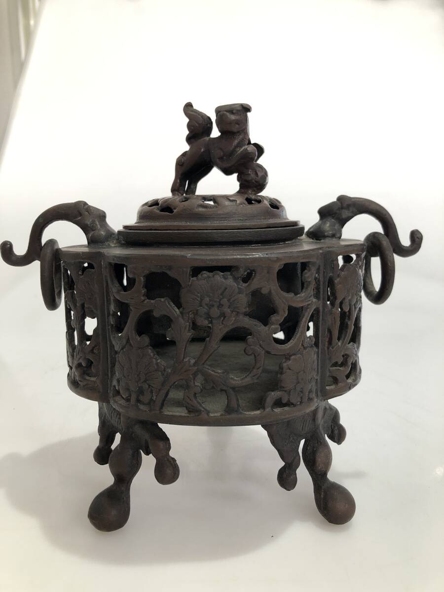 | 商品名 | 大明宣徳年製 香炉 茶道具 香道具 置物 三つ足 玉乗り獅子摘 透かし 金属工芸 |