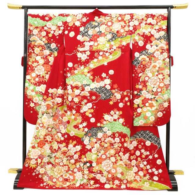 【中古】 振袖 着物 リサイクル 正絹 成人式 フォーマル 金彩加工 赤 レッド 牡丹 桜 菊 笹 流水 雲取り 花古典文様 二十歳 振袖 成人式 結婚式 春 秋 冬 仕立て上がり 身丈173 裄丈70.5 TLサイズ トールサイズ LL 2L みやがわ sb16015