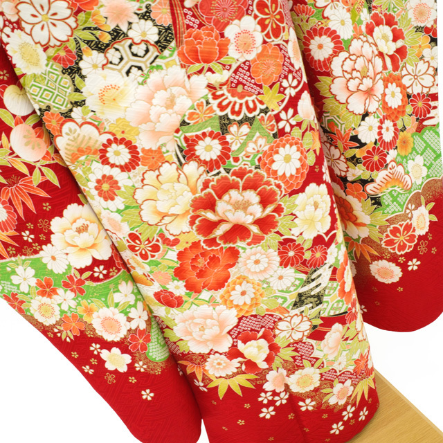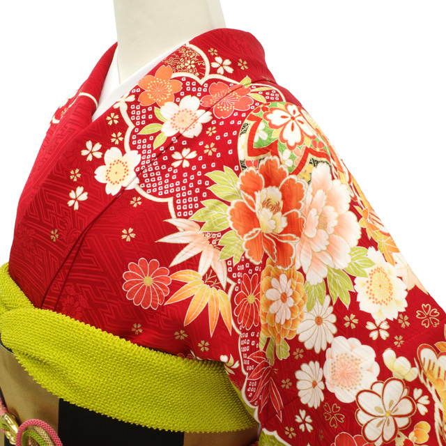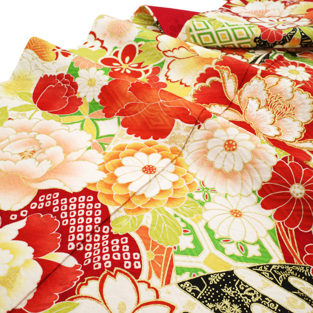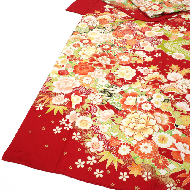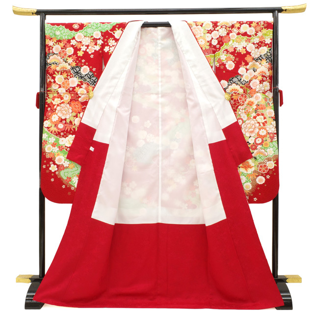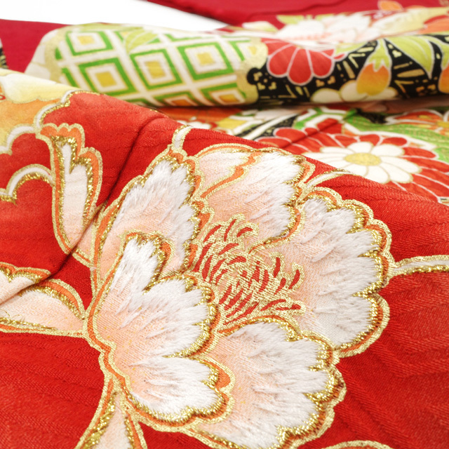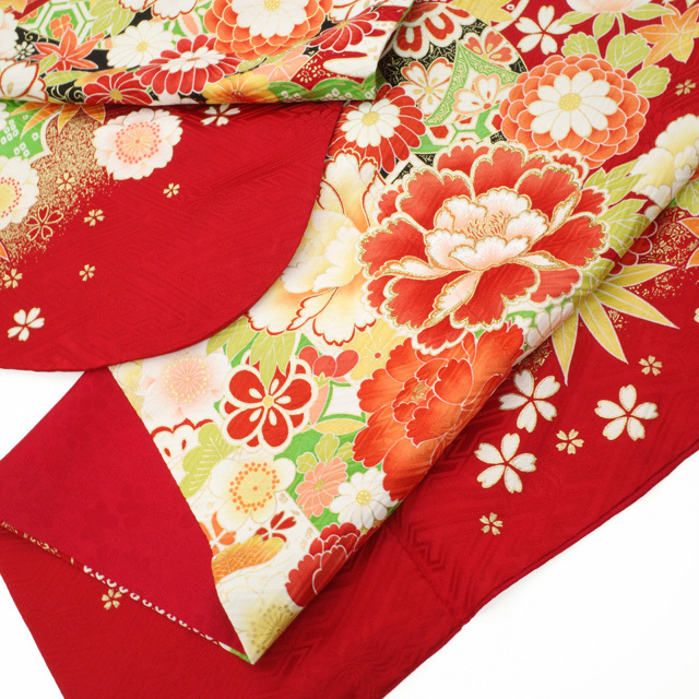 振袖 着物 リサイクル 正絹 成人式 フォーマル 金彩加工 赤 牡丹 桜 菊 中古 仕立て上がり 身丈173 裄丈70.5 TLサイズ みやがわ sb16015
