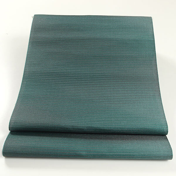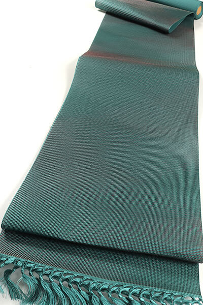 ややコシのある軽やかな帯地は、深い青緑色のお色目でございます。全体には、薄グレーや落ち着いた赤色のお色目の糸が使われており、全体にグラデーションの織りになっております。やや透け感がございますので、袷・単衣・夏のお着物に合わせて、一年を通してお締めいただけますので、大変重宝してくれることでしょう。