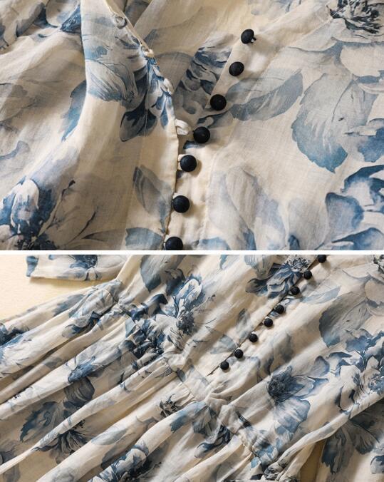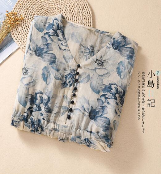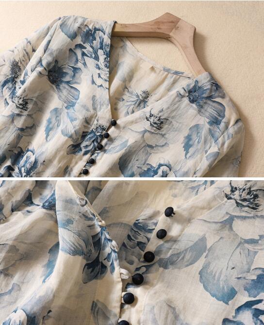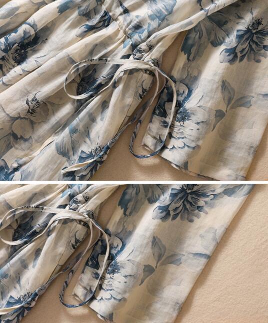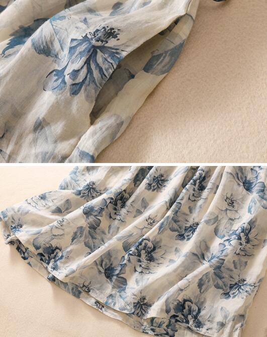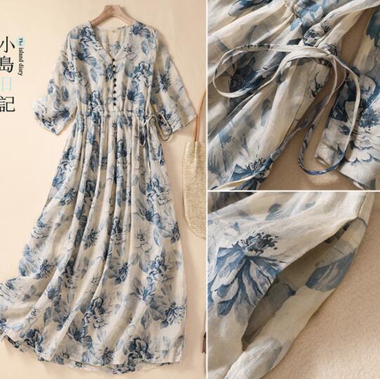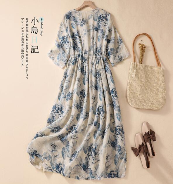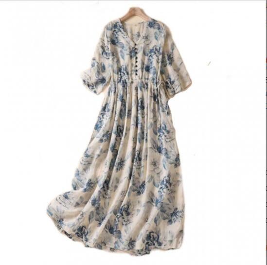 新品着やせ大人を素敵に見せる花柄プリント麻綿混ワンピース半袖レディースワンピース50代60代ファッションゆったりカジュアル 薄手 M通勤