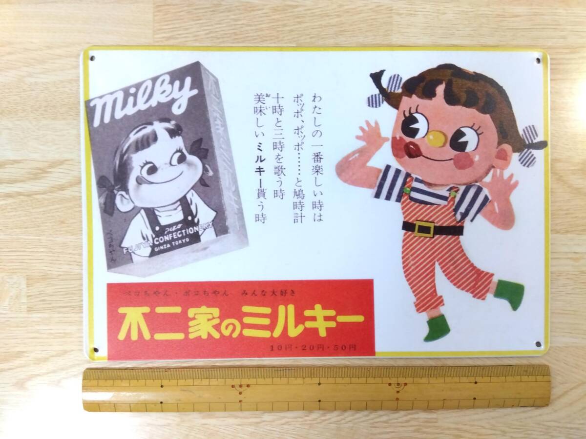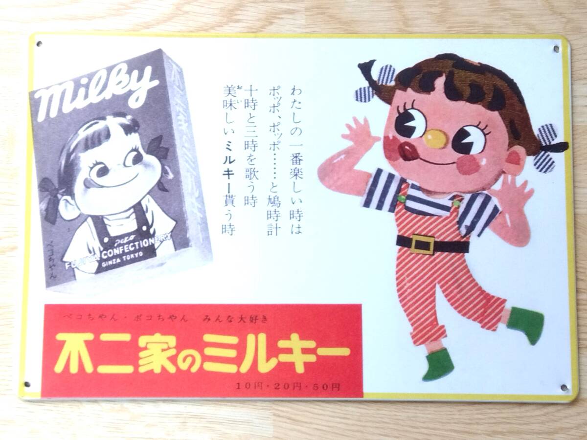 不二家FUJIYA Pekoちゃんのレトロ風ブリキの看板です。オークションで購入したUsed品です。不要になったので手放します。古さを出すために表面を汚していますのでご了承頂ける方のみご入札をお願いします。当時の物ではありませんがお部屋やお店のアクセントにいかがでしょうか。