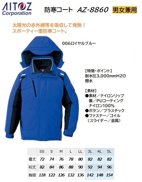 【超特価】◆アイトス [秋冬] 防寒コート AZ-8860【006ロイヤルブルー・SSサイズ】定価22550円・耐水圧3,000mmH2O・撥水の品を、即決2980円