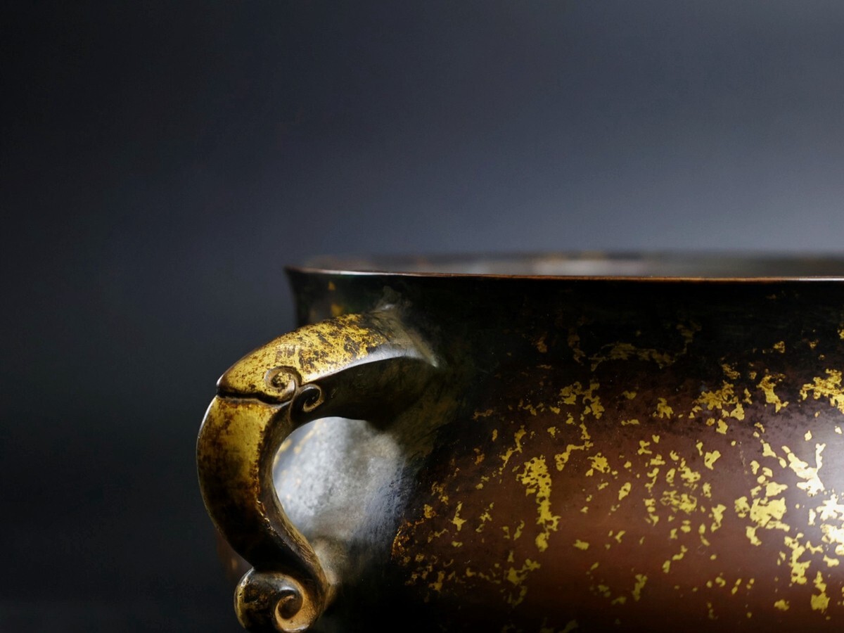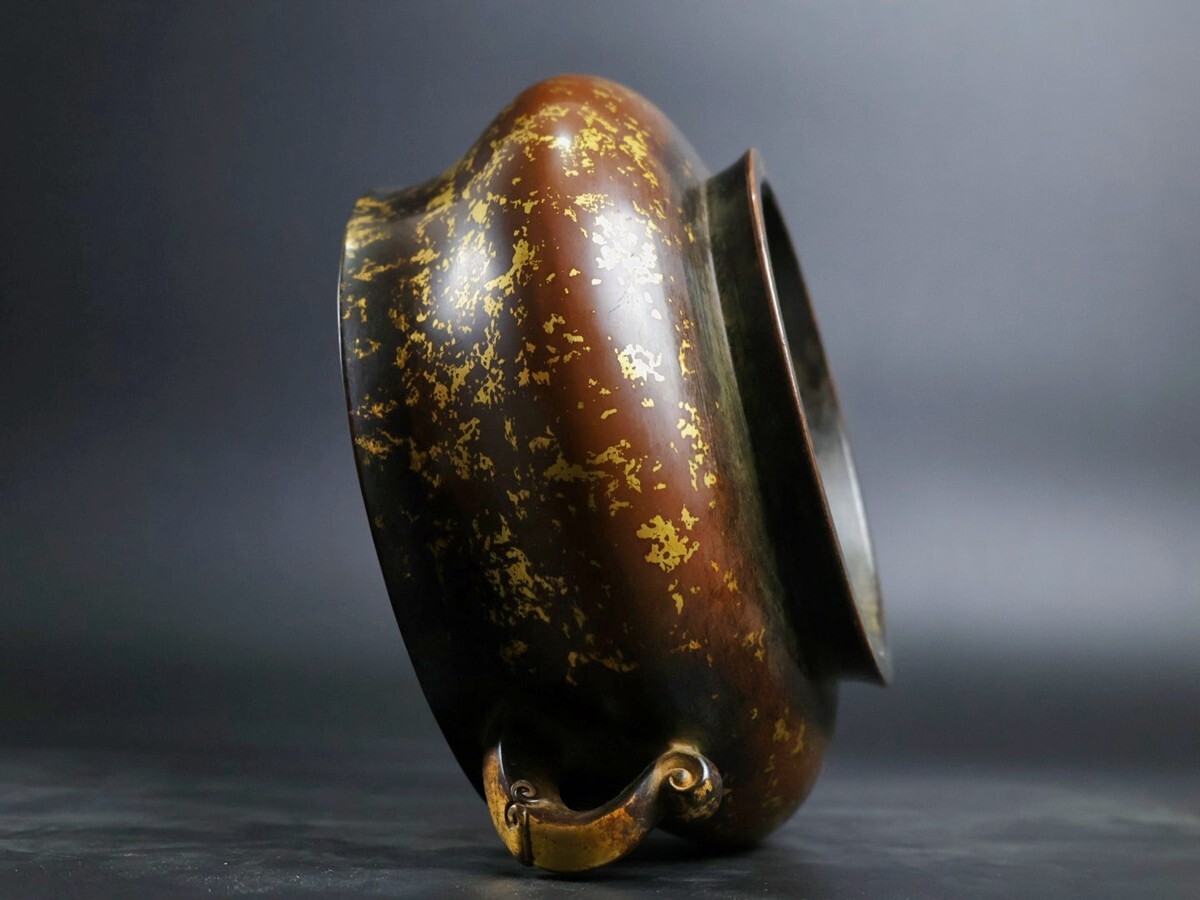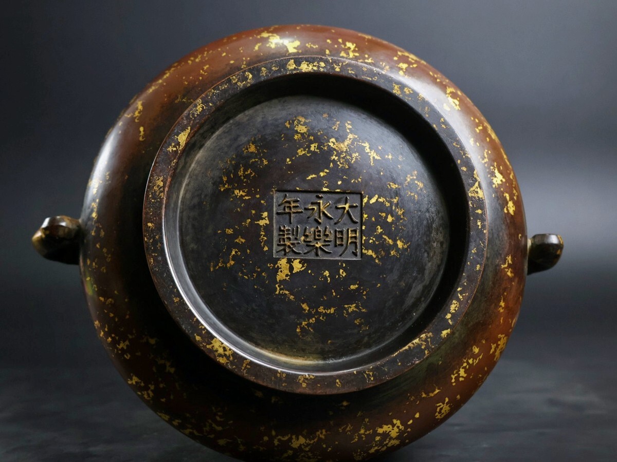 「明代 大明永楽年製 古銅彫 灑金双耳 老銅香炉」旧銅器 置物擺件 賞物 中国古美術 旧蔵出