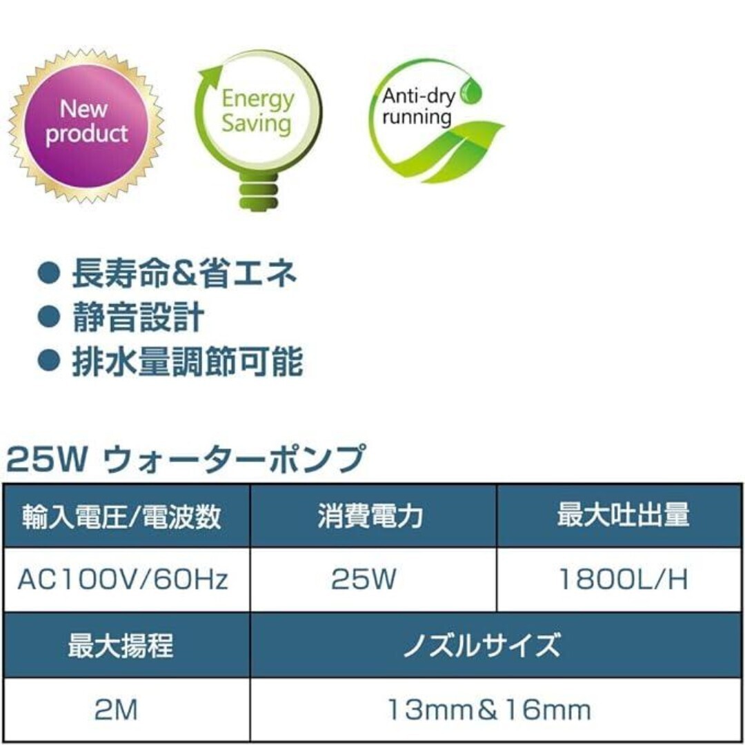 商品仕様・詳細サイズ: 10 x 12.5 cm重量: 570g電源: AC100V/60Hz消費電力: 25W最大流量: 1500L/H最大揚程: 1.8m吐出ノズル径: 13mm & 16mmコード長さ: 1.9m騒音レベル: 40デシベル以下