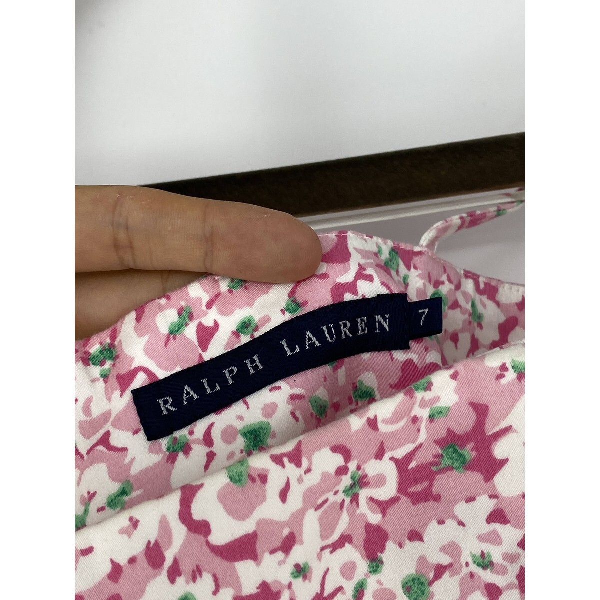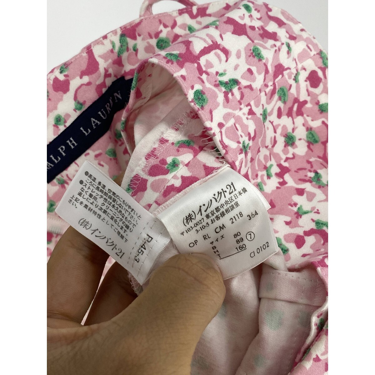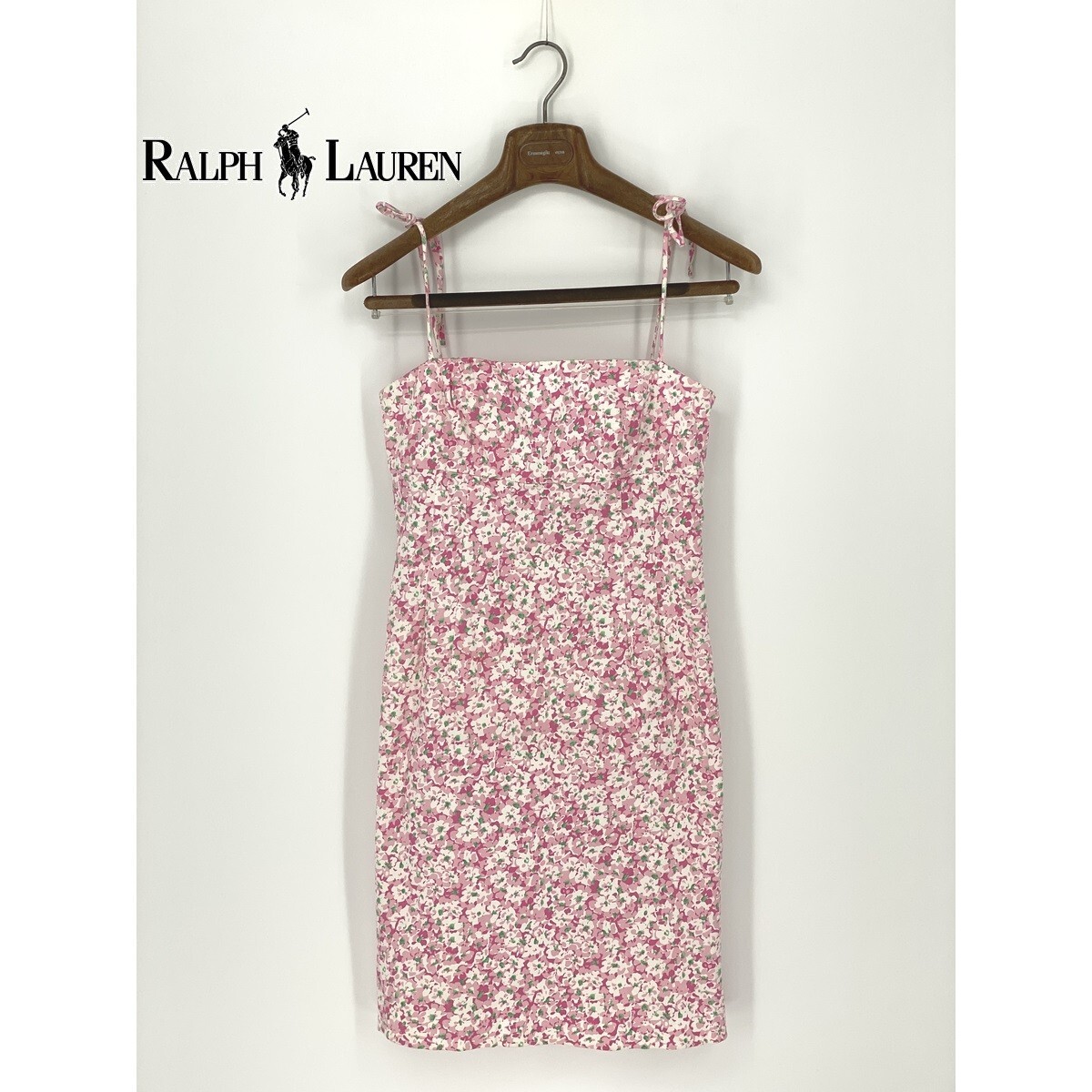 B0068/極美品 RALPH LAUREN ラルフローレン コットン 花柄 総柄 ストレッチ 肩紐 ノースリーブ 膝丈 ワンピース 7 M ピンク レディース