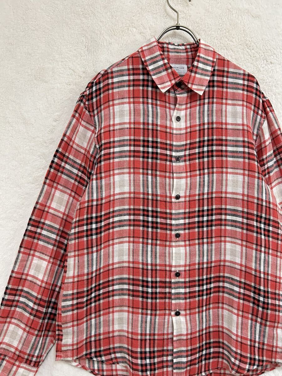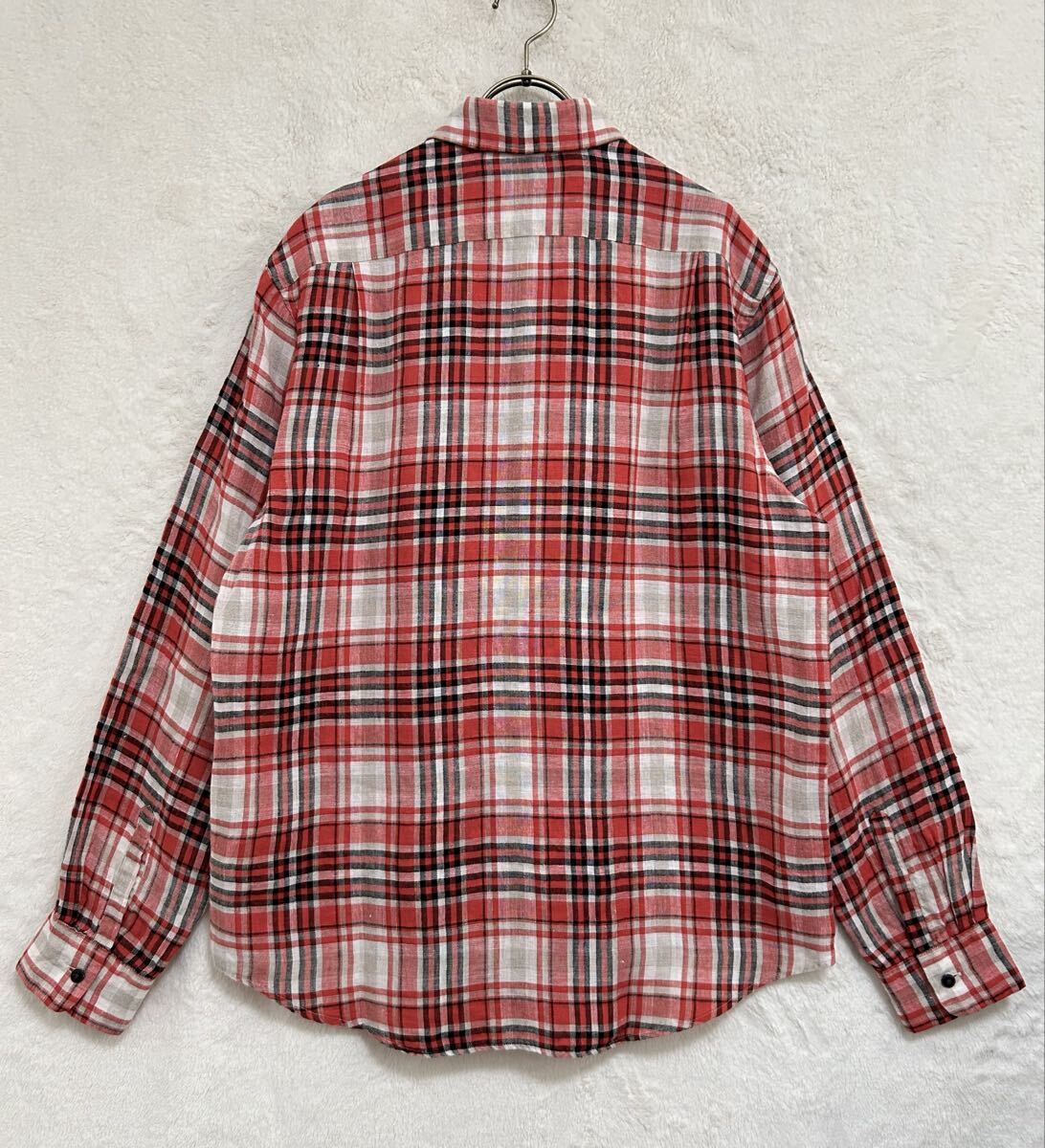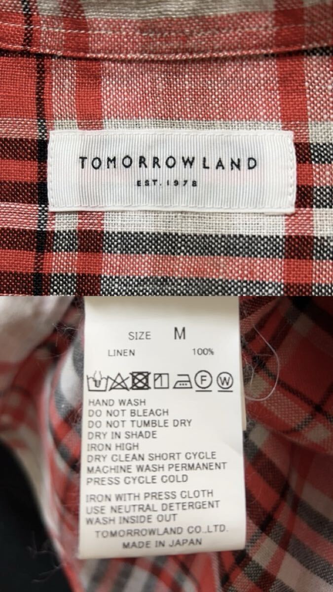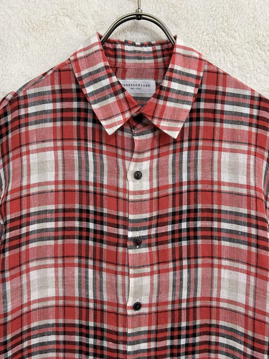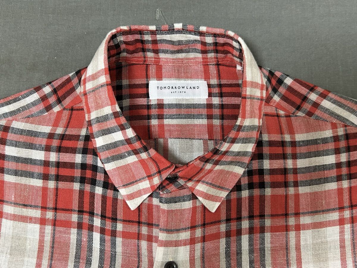 【新品同様】春夏物 トゥモローランド TOMORROW LAND メンズ リネン100% 長袖シャツ Mサイズ ベージュ×朱赤、黒 チェック柄 クリーニング済み